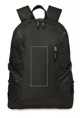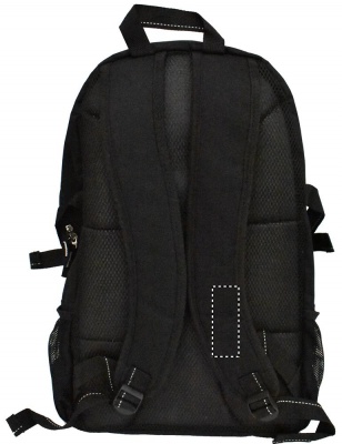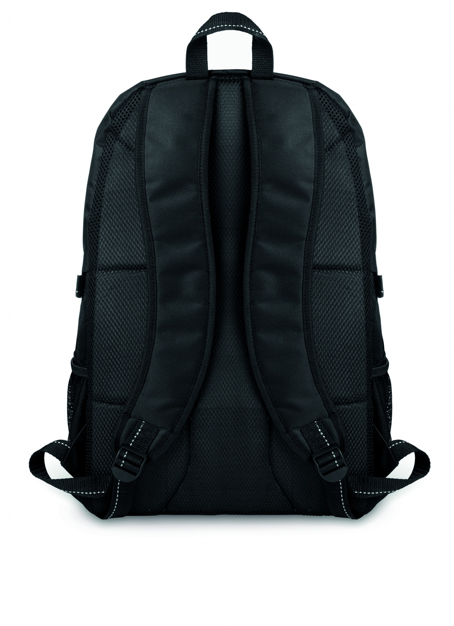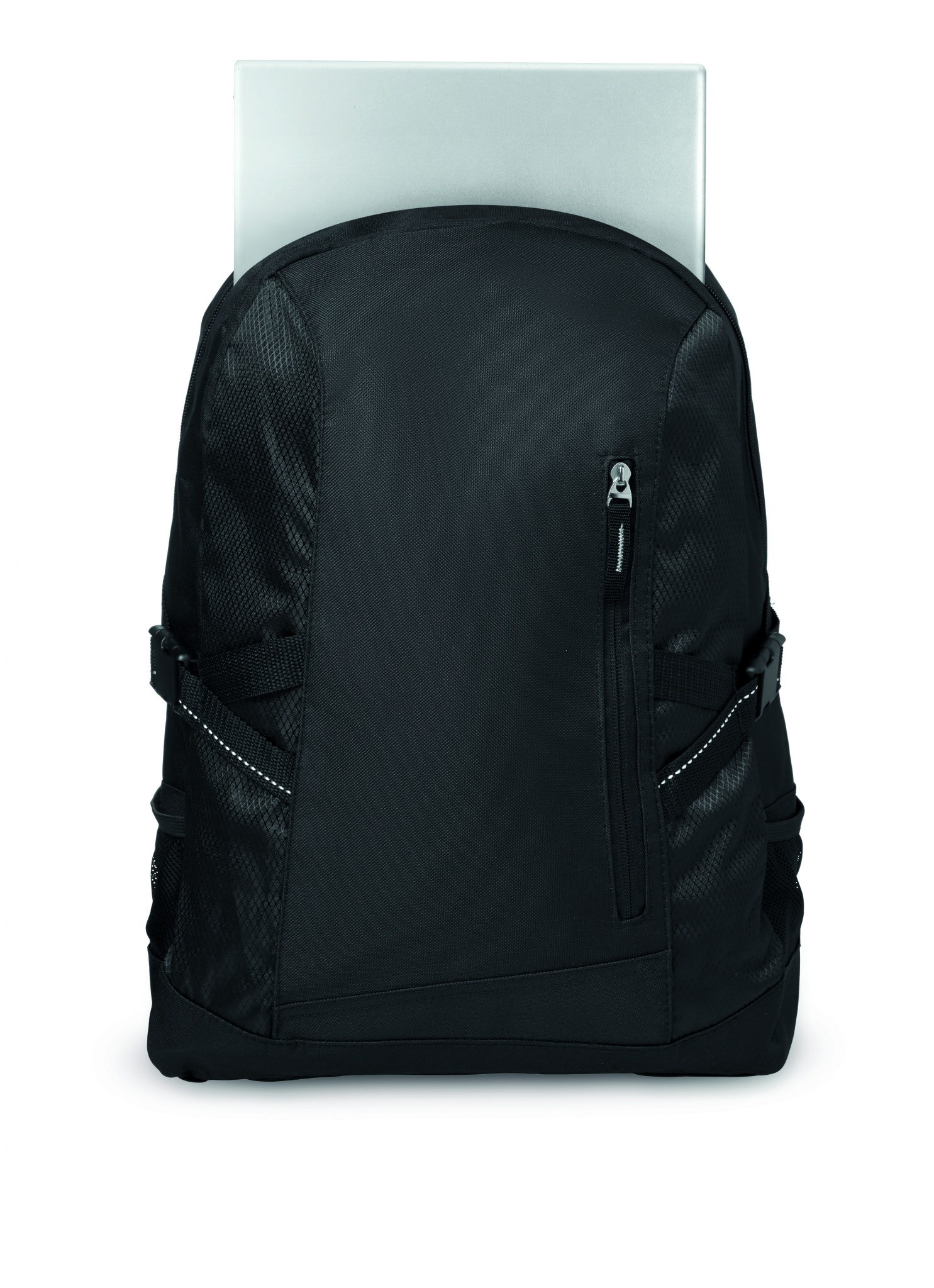 15 laptop backpack in 600D with rip stop details. Includes one internal 15 laptop compartment, one main front zippered pocket and 2 side compartments. Adjustable shoulder strap.
