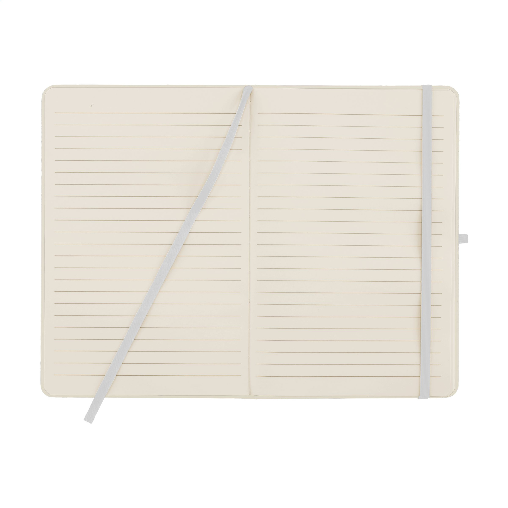 WoW! Practical notebook in A5 format. With hard RPET cover (made from PET bottles) and approx. 80 sheets/160 sheets of cream coloured, lined paper (70 g/m²). With handy elastic closure, reading ribbon and pen loop.