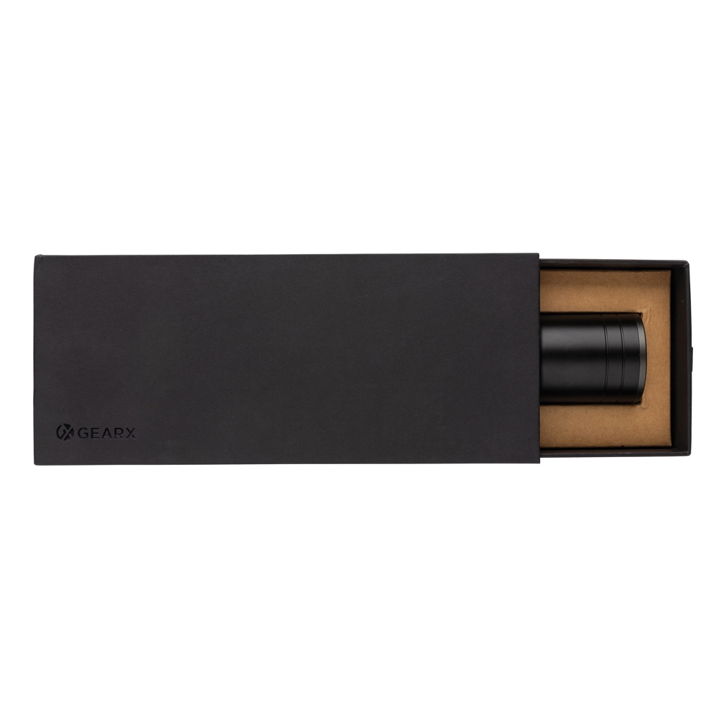 Functionality, performance and design all come together in this re-chargeable 10W torch made with RCS certified recycled aluminum. Total recycled content: 20% based on total item weight. RCS certification ensures a completely certified supply chain of the recycled materials. Because of its IP4 rating, it is weatherproof so can easily be taken outside. The powerful bulb creates up to 1500 lumen and a beam that reaches up to 800 metres. The torch uses a re-chargeable A-grade battery so no need to replace the batteries. Simply re-charge via your USB socket and the included RCS certified recycled type C cable. The high quality bulb comes with 5 modes including SOS function. The 4000 mah battery allows a usage up to 10 hours on a single charge and allows charging your mobile devices via type C. Aluminum does not lose its characteristics in the recycling process and can be recycled endlessly. Item and accessories 100% PVC free. Packed in FSC mix packaging. Input Type-C 5V, 1A; Output 5V, 1A