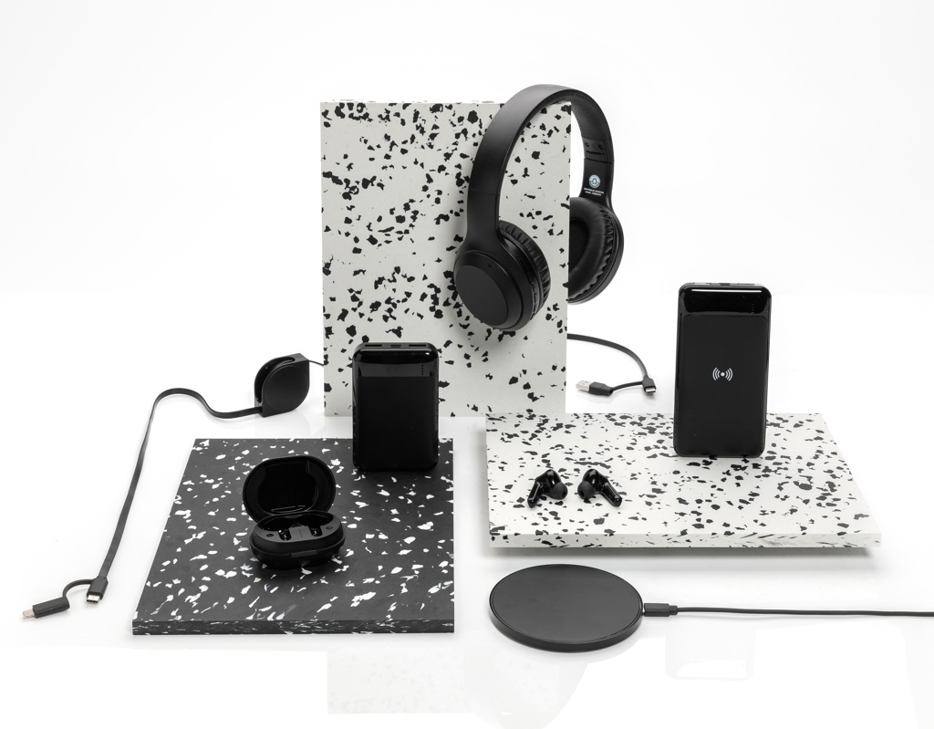 8.000 mAh powerbank with 5W wireless charger where the case is made out of RCS certified recycled ABS plastic. RCS (Recycled Claim Standard) is a standard to verify the recycled content of a product throughout the whole supply chain. Total recycled content: 22% based on total item weight. When fully charged the powerbank provides you with enough energy to re-charge your mobile phone up to four times. The powerbank contains a long lasting grade A 8.000 mAh lithium polymer battery. The power indicators will indicate the remaining energy level so you always know when to re-charge. Type-C input 5V/2A; Micro USB Input 5V/2A; Wireless Output 5W; 2x USB output 5V/2A; Item and accessories PVC free. Including PVC free recycled TPE material charging cable.
