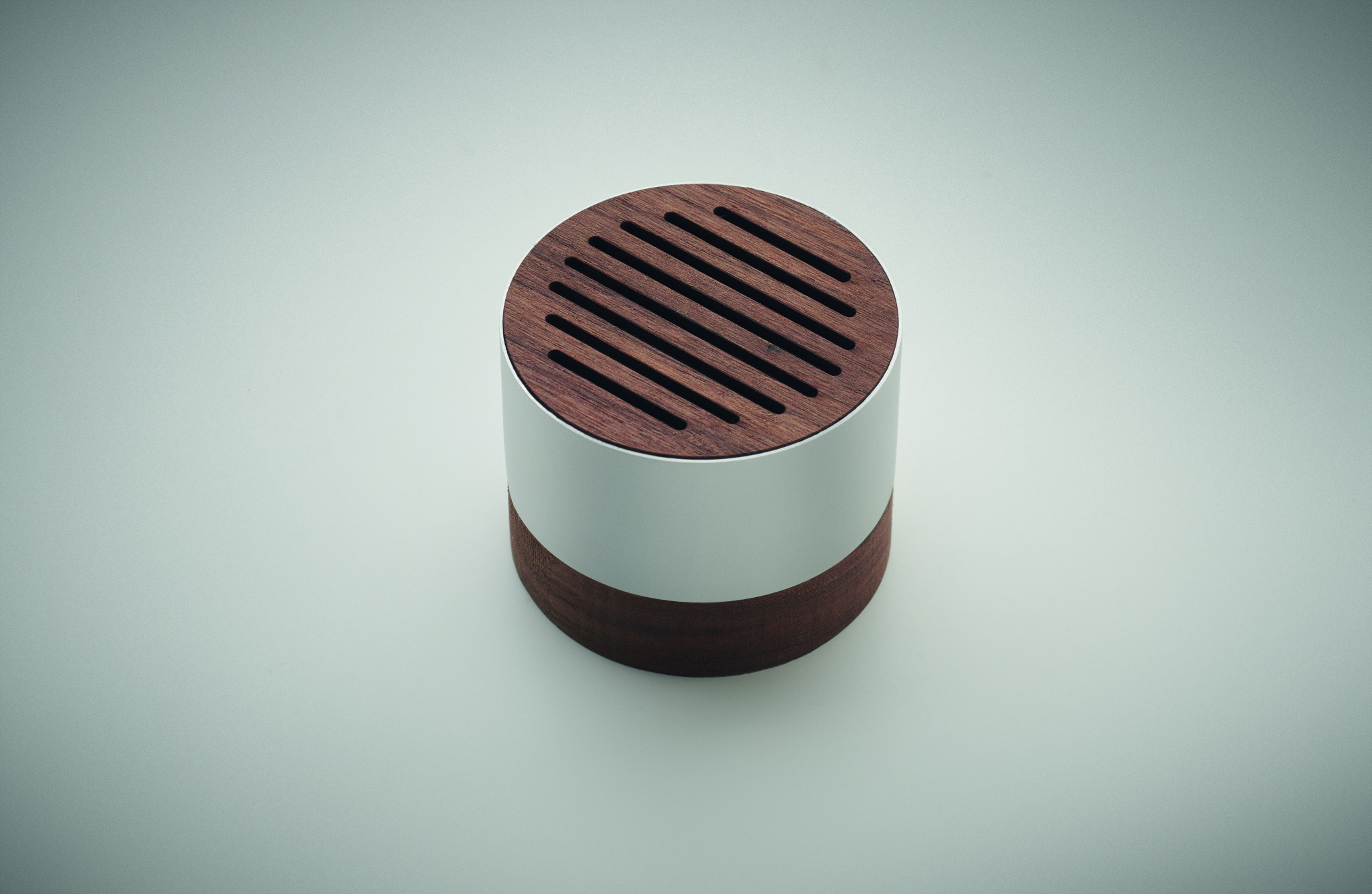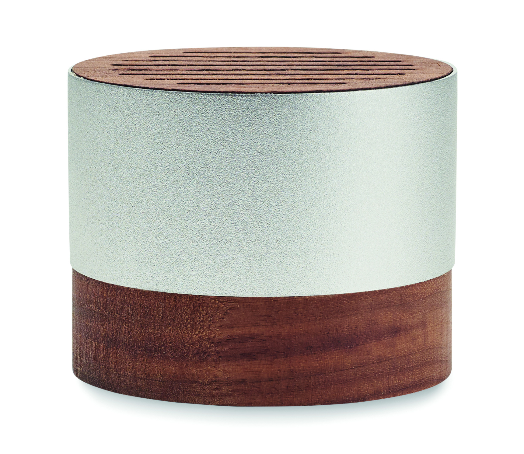 5.3 wireless speaker in recycled aluminium casing with walnut base and top detail. 1 Rechargeable Li-ION 300 mAh battery included. Output data: 3W, 3 Ohm and 5V. Playing time approx. 3h.