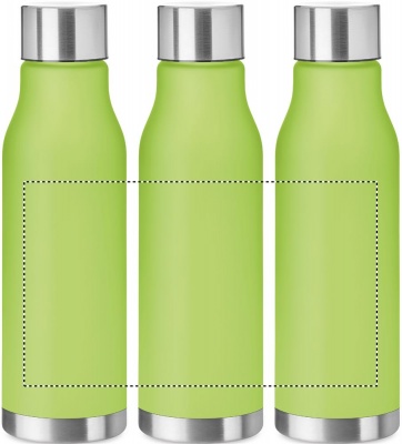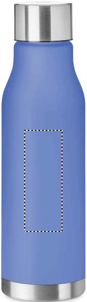 Drinking bottle in RPET with rubberised finish (frosted transparent) and stainless steel cap with inner RPET lid and silicone ring. BPA free. Leak-free. Capacity: 600 ml. Not suitable for carbonated drinks.