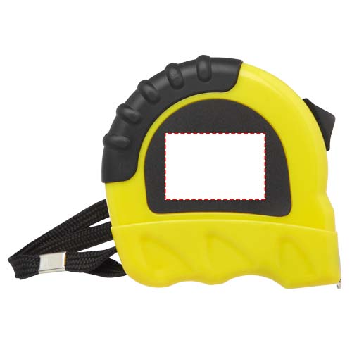 5-metre steel and iron measuring tape including an iron belt clip and a polyester wrist strap. Shows centimetres and inches. The case is made of 17% RCS certified recycled plastic and 3% recycled TPE. The Recycled Claim Standard (RCS) verifies the recycled content of a product throughout the entire supply chain. Packed in a STAC gift box from sustainable sources.