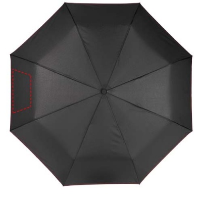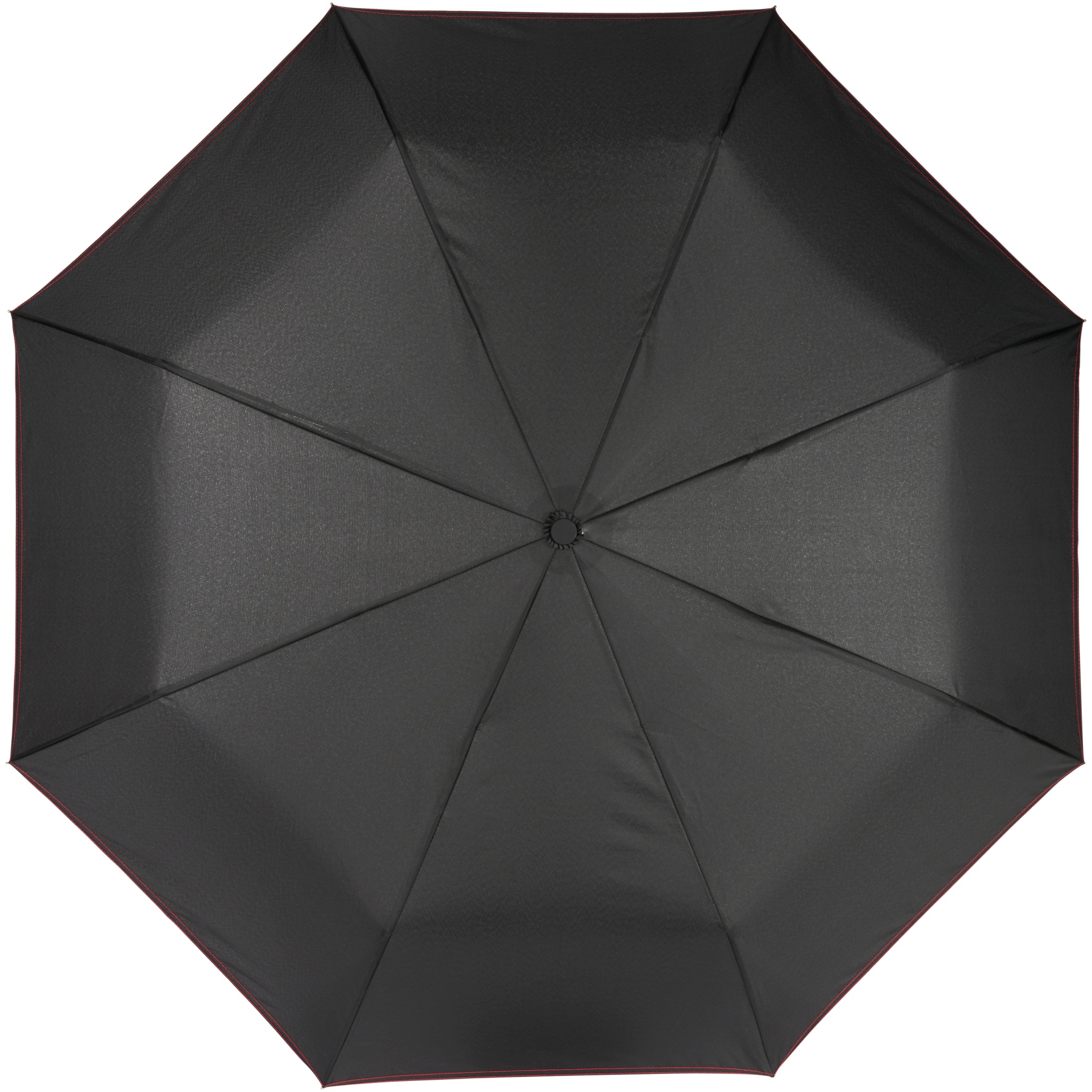 Automatic open and close foldable umbrella with a pongee polyester canopy. Sturdy metal shaft, a high quality frame with fibreglass ribs that offers maximum flexibility in windy conditions. Supplied with a pouch and can easily fit in a handbag or backpack for convenient carrying. Coloured details are available on the soft touch handle and detailed sewing on the canopy and pouch. Large decoration area on each of the panels, as well as the handle.