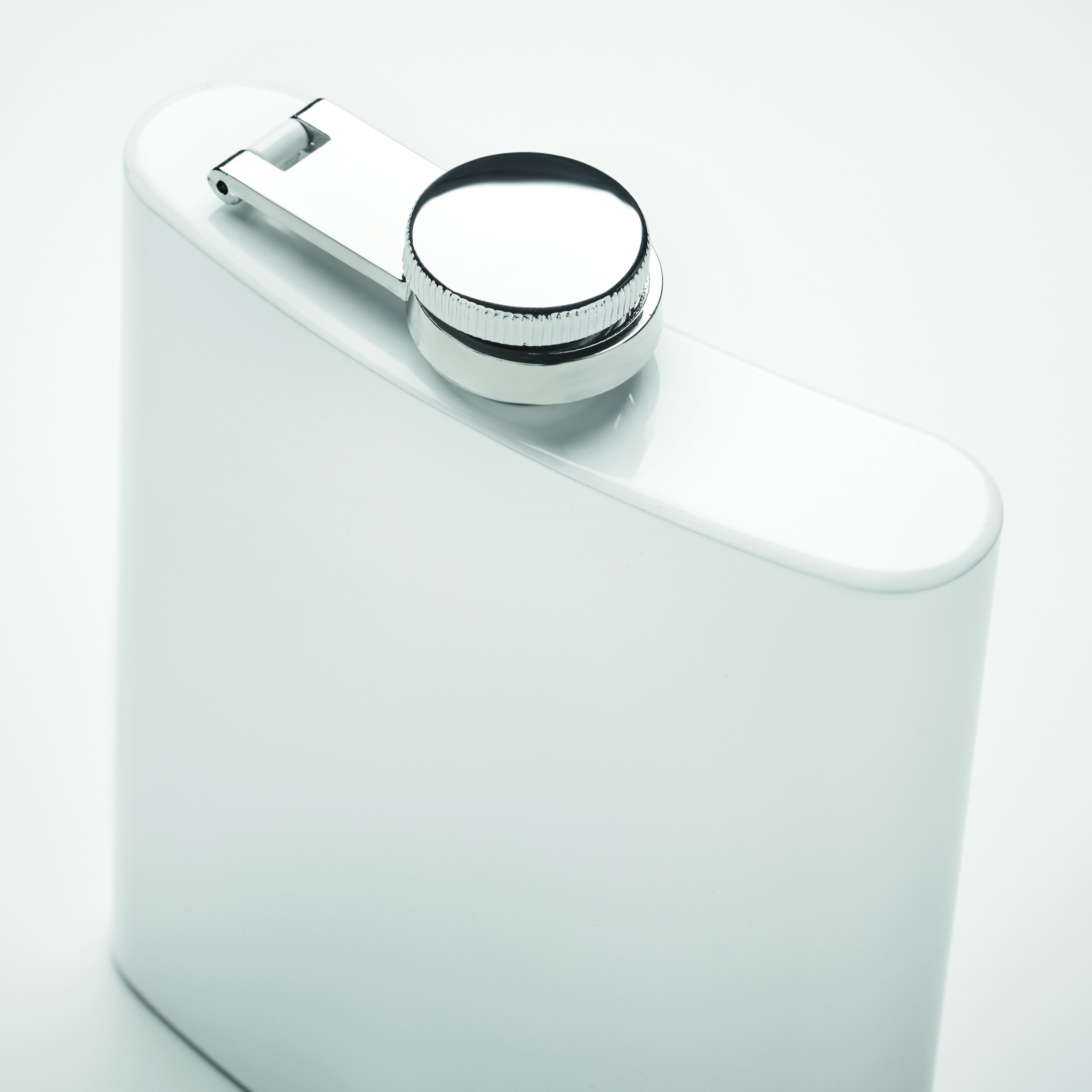 Slim hip flask in recycled stainless steel (90% recycled stainless and 10% stainless steel) with sublimation layer. Single wall. Capacity: 180 ml.