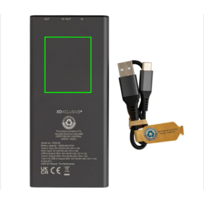 Ultra-fast charging powerbank made with RCS (Recycled Claim Standard) certified recycled aluminium and ABS. Total recycled content: 27% based on total item weight. RCS certification ensures a completely certified supply chain of the recycled materials. Aluminium does not lose its characteristics in the recycling process and can be recycled endlessly. The powerbank contains a long-lasting grade A 10.000 mAh lithium polymer battery. The C output port supports fast charging up to 18W and also fast re-charging within 3 hours. The power indicators will indicate the remaining energy level so you always know when to re-charge. Item and accessories 100% PVC free. Including type C charging cable made from RCS certified recycled aluminium, TPE and PET. Packed in FSC® mix packaging. USB output 5/3A, 9V/2A. 12V/1.5A. Type C output: 5V/3A, 9V/2A, 12V/1.5A. Type C input: 5V/3A, 9V/2A, 12V/1.5A. Micro USB input: 5V/2A, 9V/2A, 12V/1.5A.