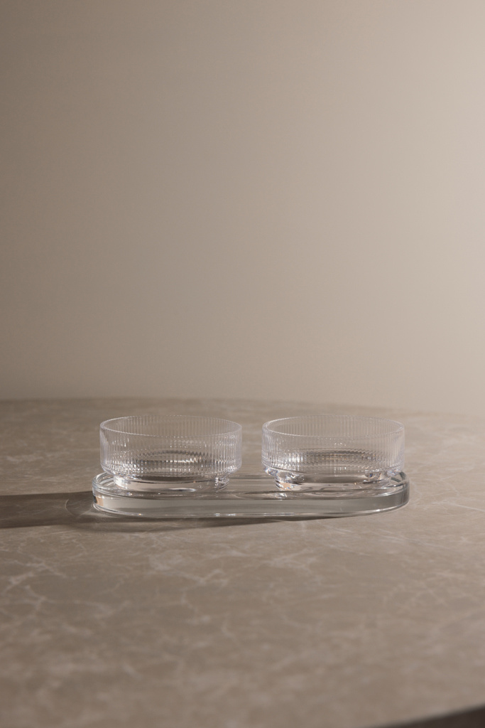 A tapas set with timeless design and classic, clean lines. Perfect for any occasion where you want to serve small dishes, snacks, or other sides with style and elegance. The set includes two bowls and a tray, which can be used together or separately. Made from soda-lime glass. The bowls hold 250 ml. Dishwasher safe.