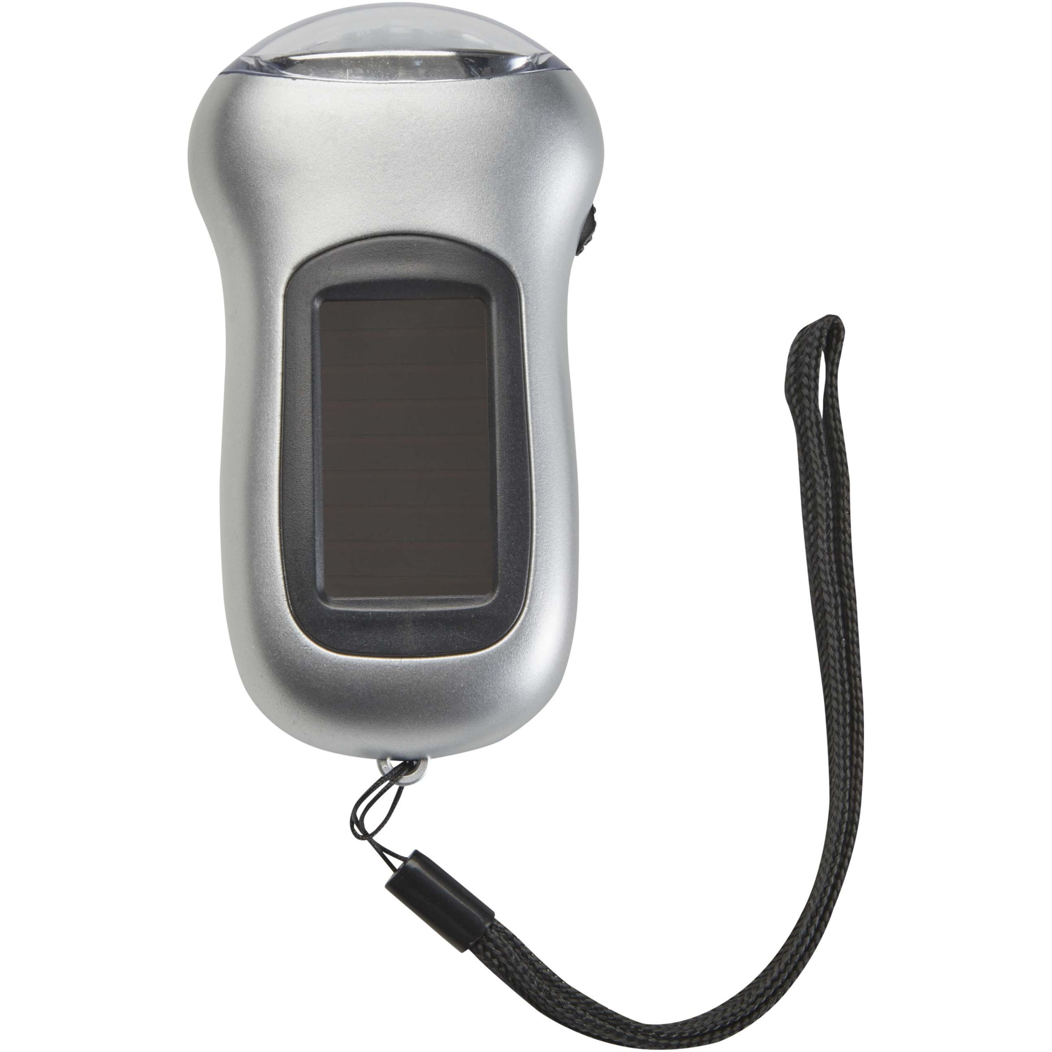 Compact solar torch with a brightness of 10.000 mcd. The torch can also be powered manually by turning the handle.
