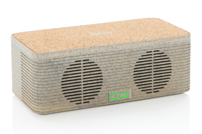 This sleek looking wheat straw (35% wheat fiber mixed with ABS) and cork wireless charging speaker enables you to combine listening to your favorite tunes while charging your phone wirelessly. Simply connect the included 150 cm Type C cable to your charger at home or in the office and you are ready to go. It contains a 5W wireless speaker and a 5W wireless charger on top with a Type C input port and AUX port. The speaker has a 1200 mAh battery and BT 5.0 that allows a playtime up to 4 hours and operating distance up to 10 metres. When using both functions make sure the item is connected to a power source.