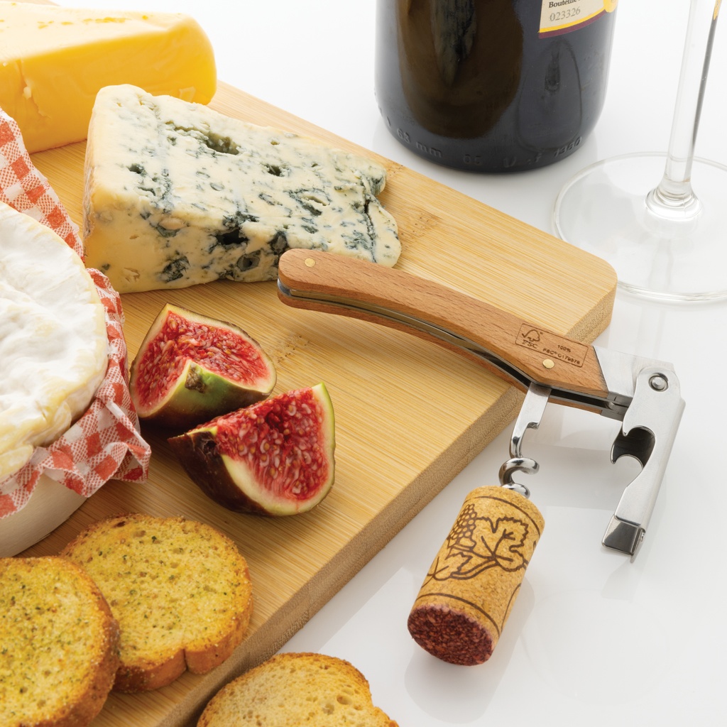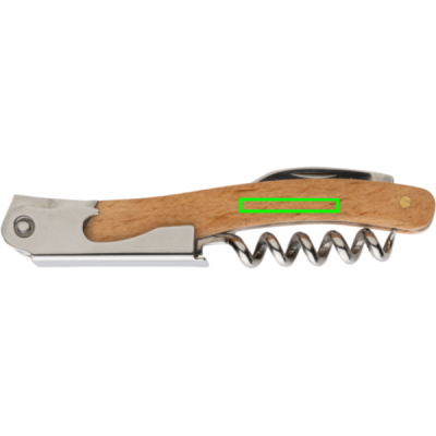 Professional corkscrew made with FSC 100% beech wood and high hardness and corrosion resistant stainless steel (420). Rockwell hardness 45-55. The item comes with 3 functions: Bottle opener, Cork screw & Foil cutter. Packed in FSC mix kraft box.