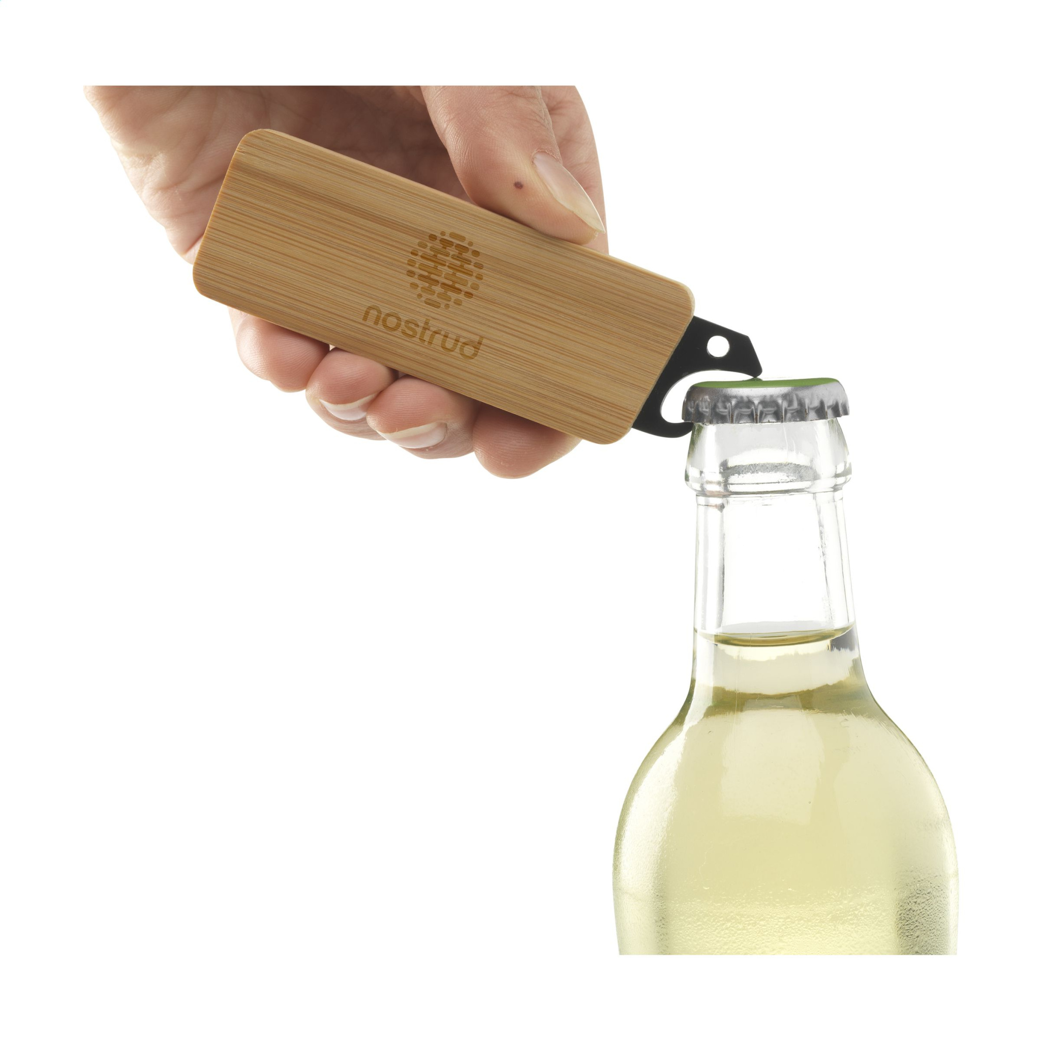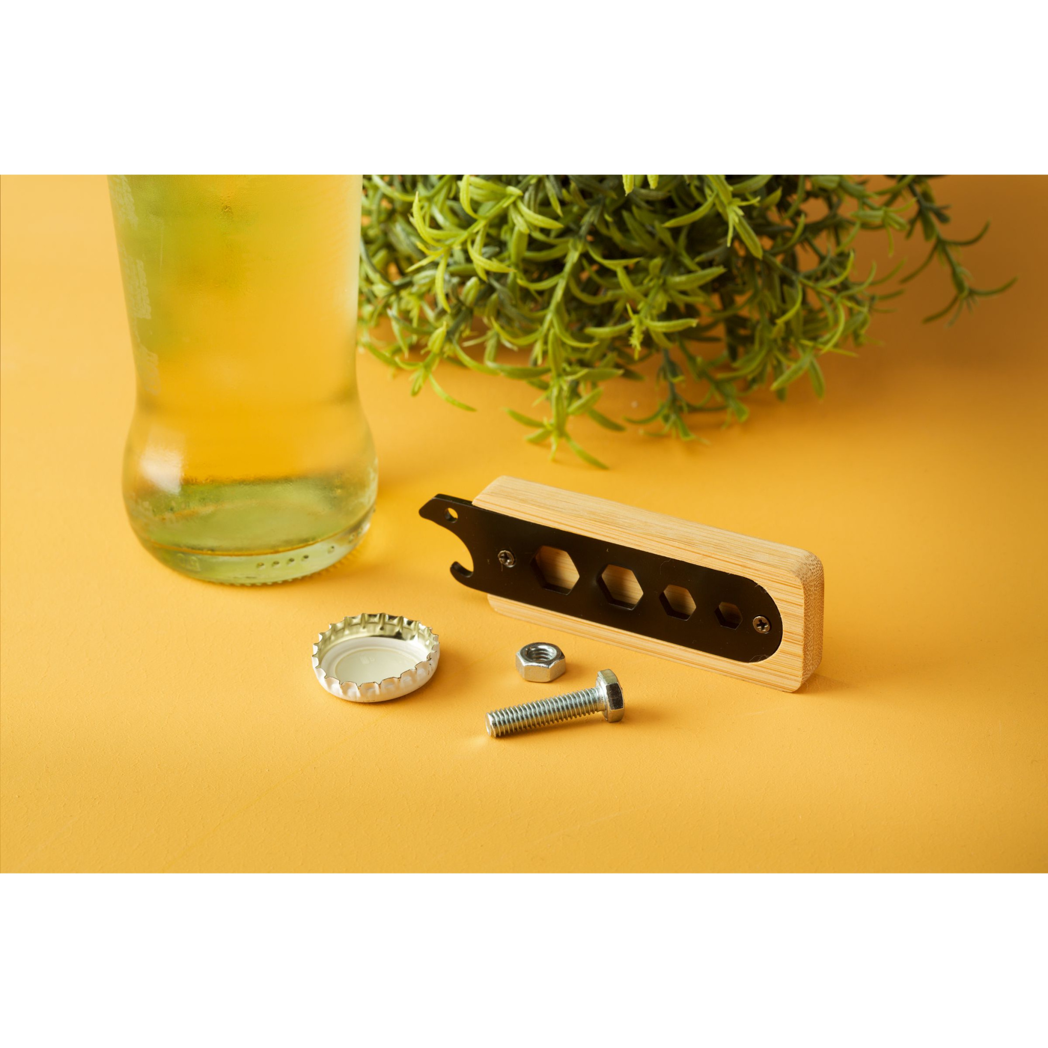 Handy multi-tool with a stainless steel bottle opener with a bamboo handle and 4 flat wrenches in various sizes.