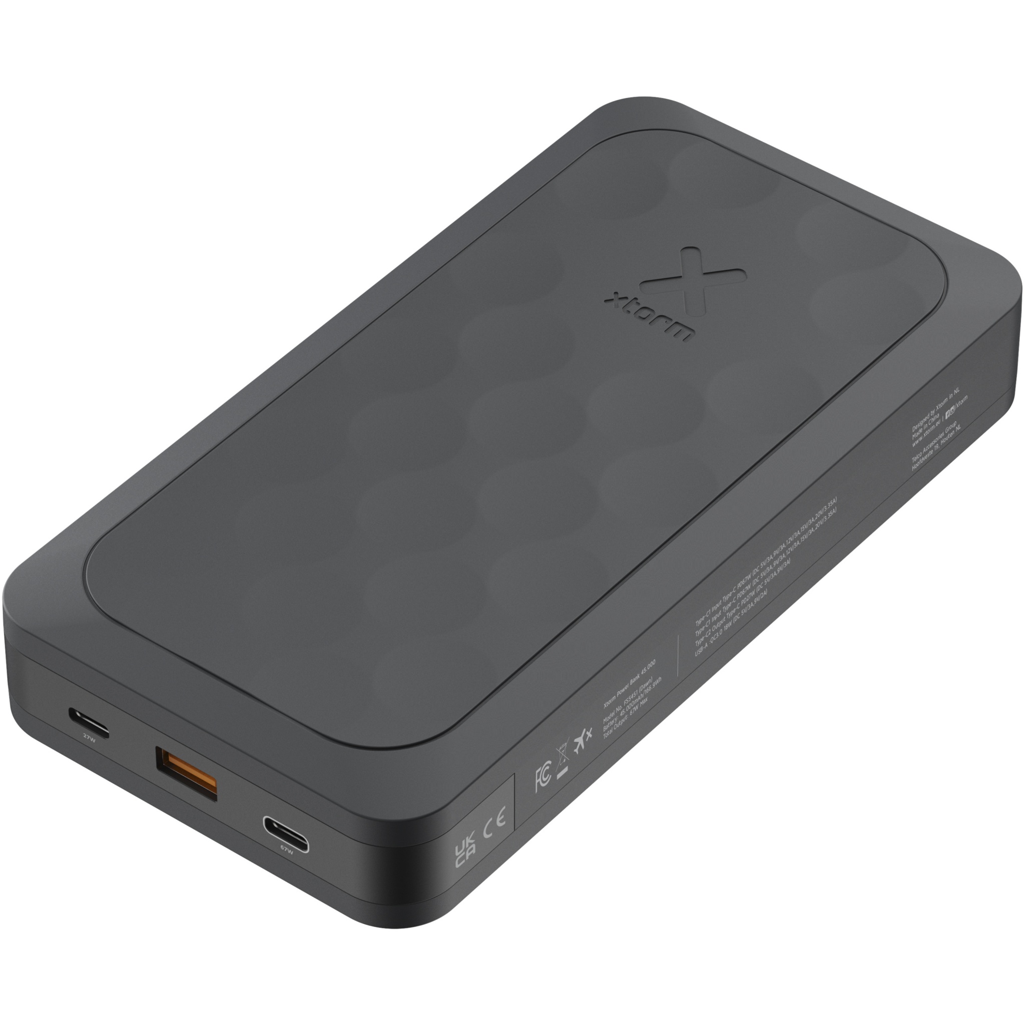 The high capacity 45.000 mAh Fuel Series power bank has 2 ultra-fast USB-C PD ports and one USB-A port. This allows you to charge various mobile devices and even laptops quickly! The unique pattern on the power bank creates a powerful look. Output: 1 USB-C 67W power delivery, 1 USB-C 27W power delivery, and 1 USB-A 22.5W. Delivered with a USB-C to USB-C cable, and a user manual.