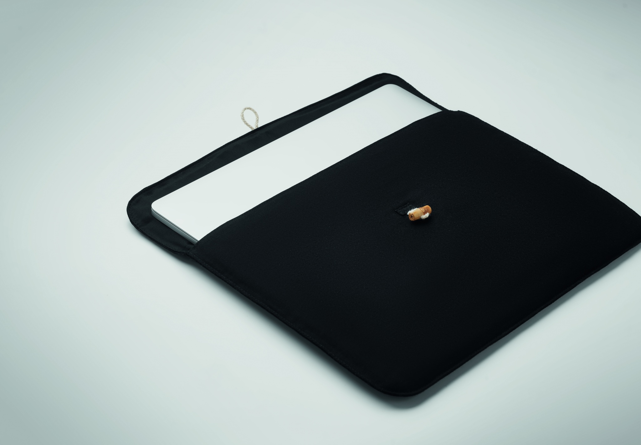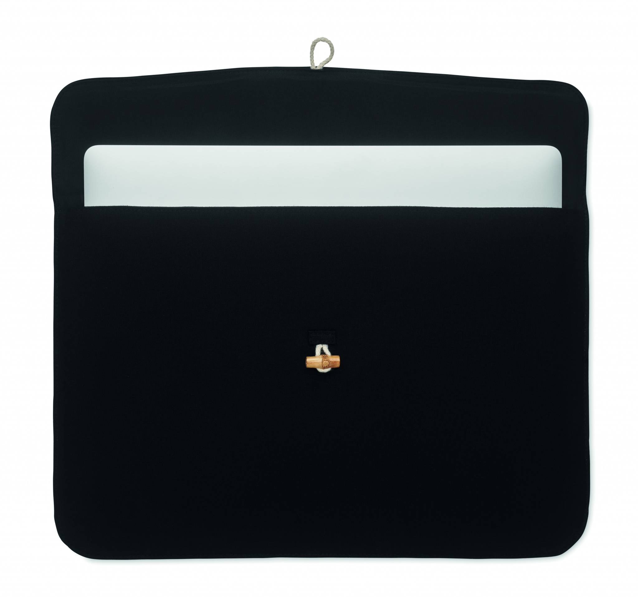 15-tolline polsterdatud sülearvutikott 220 gr/m² puuvillast. Sisevooder 120 gr/m². Bambusest nööbiga kinnis.