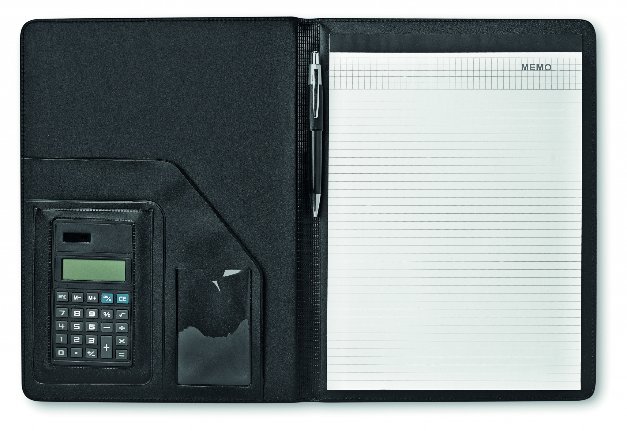 A4 kunstnahast portfell. 20 joonelise lehega märkmik. Päikeseenergial töötav kalkulaator. Metallist pastapliiats. Sinine tint.