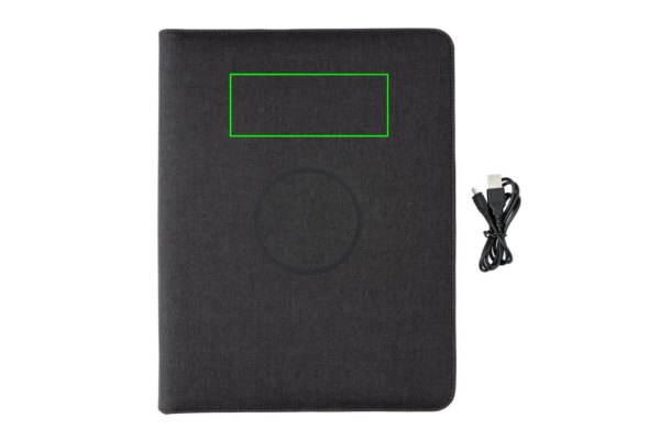 See A4-formaadis portfolio-märkmik sisaldab uusimat tehnoloogiat. Esikaanel on juhtmevaba laadimisalus teie telefoni jaoks. (Androidi uusimad põlvkonnad, iPhone 8 ja uuemad). Vanemaid telefone ja tahvelarvuteid saab laadida USB-portide kaudu välise 5000 mAh toitepangaga. Sisend: 5,0V/2,1A. Väljund 1: 5,0V/2,1A. Väljund 2: 5,0 V/2,1 A. Juhtmeta väljund: 5 W. Registreeritud disain®
