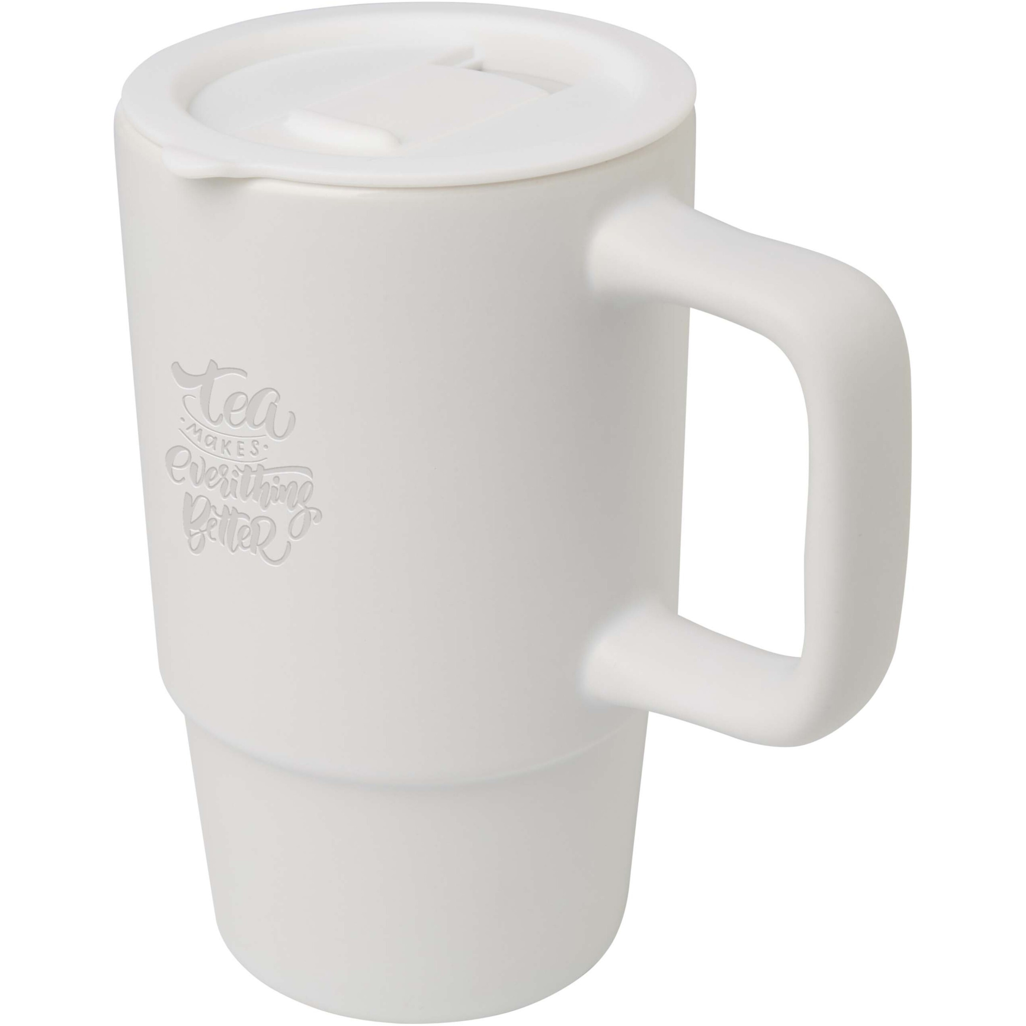 Keraamiline kruus, millel on suur käepide ja pritsmekindel plastikust kaas. Pakendatud taaskasutatud papist kinkekarpi. Mahutavus: 450 ml.