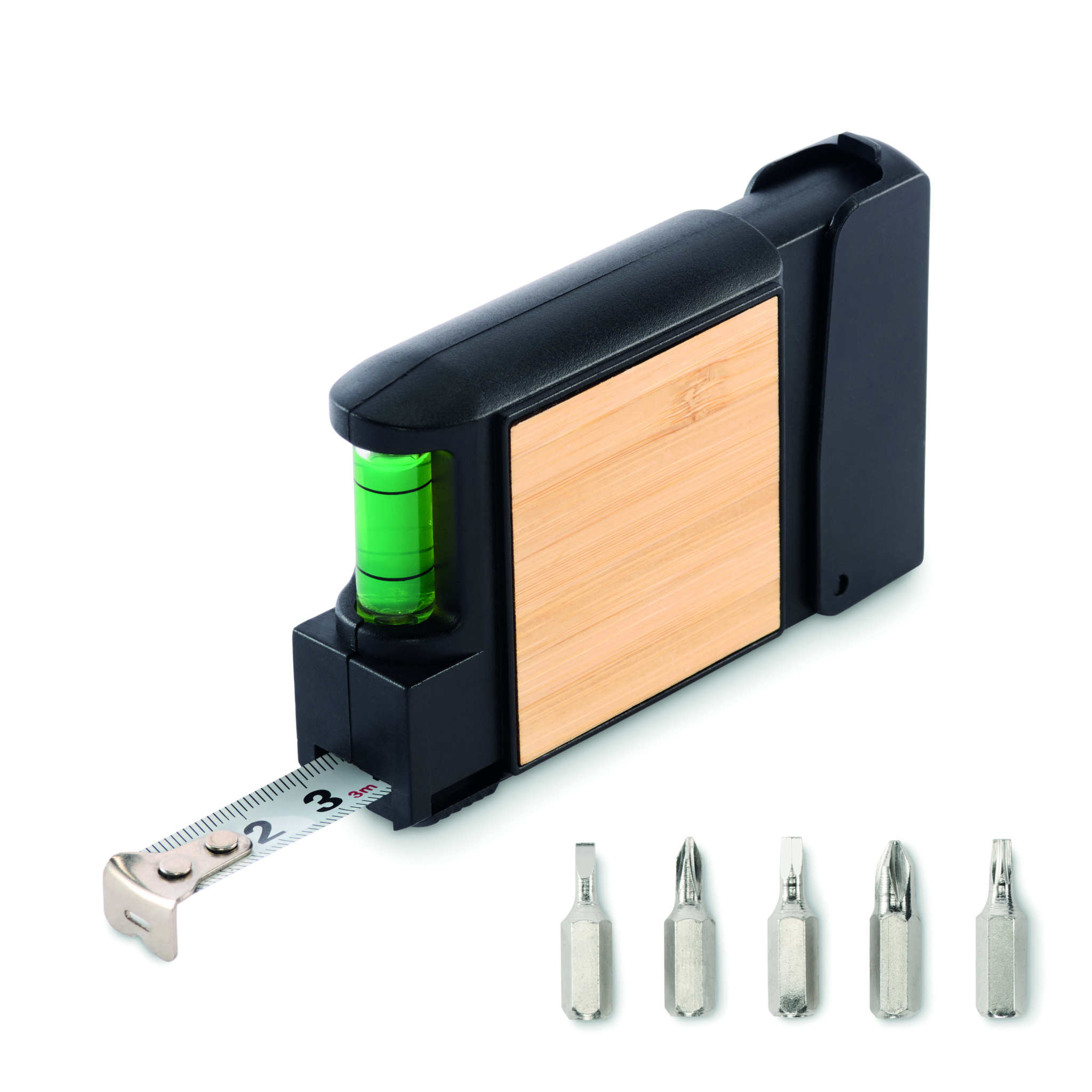 3M multifunktsionaalne bambusest detailiga mõõdulint, sealhulgas vesiloodi ja 5 otsaga kruvikeerajate komplekt.