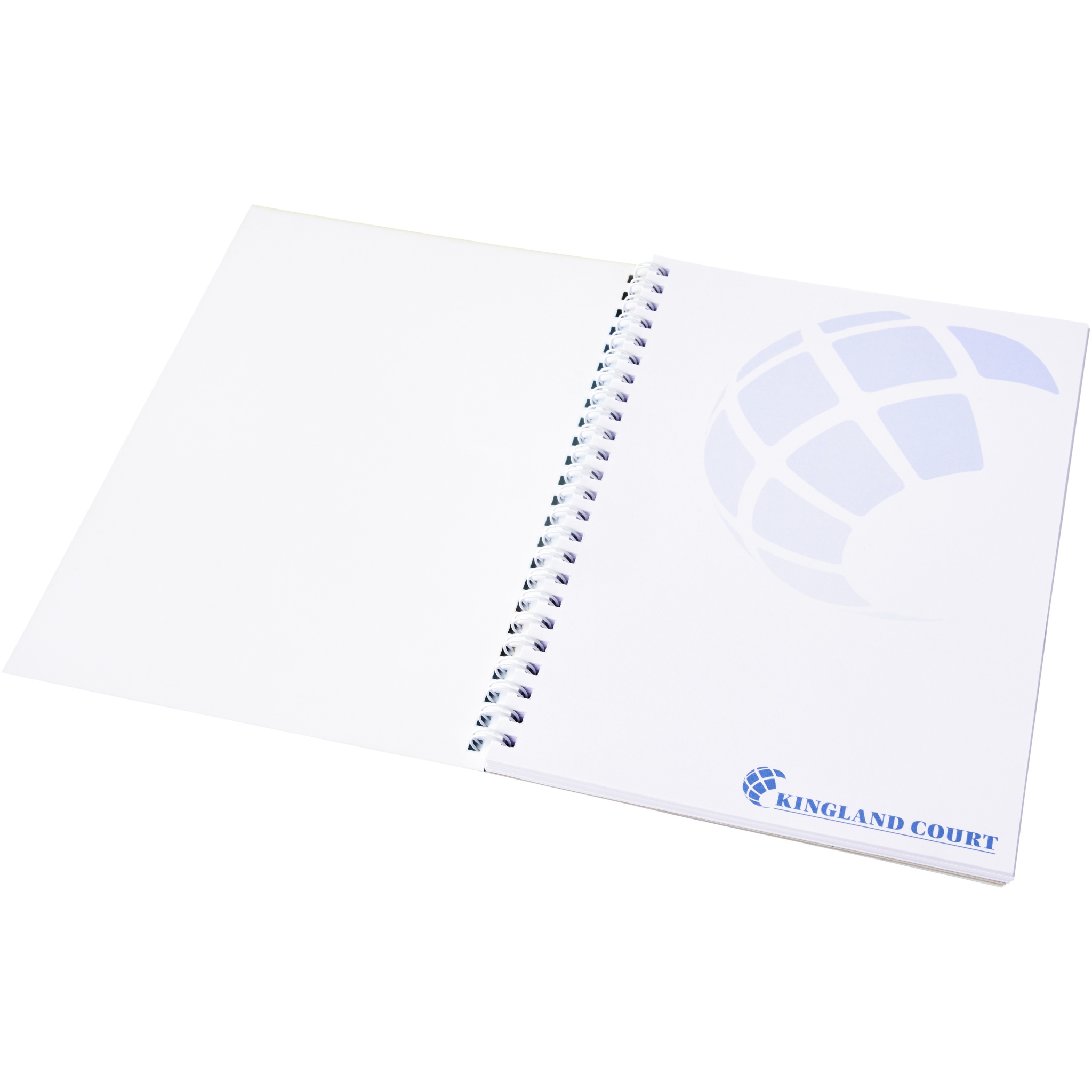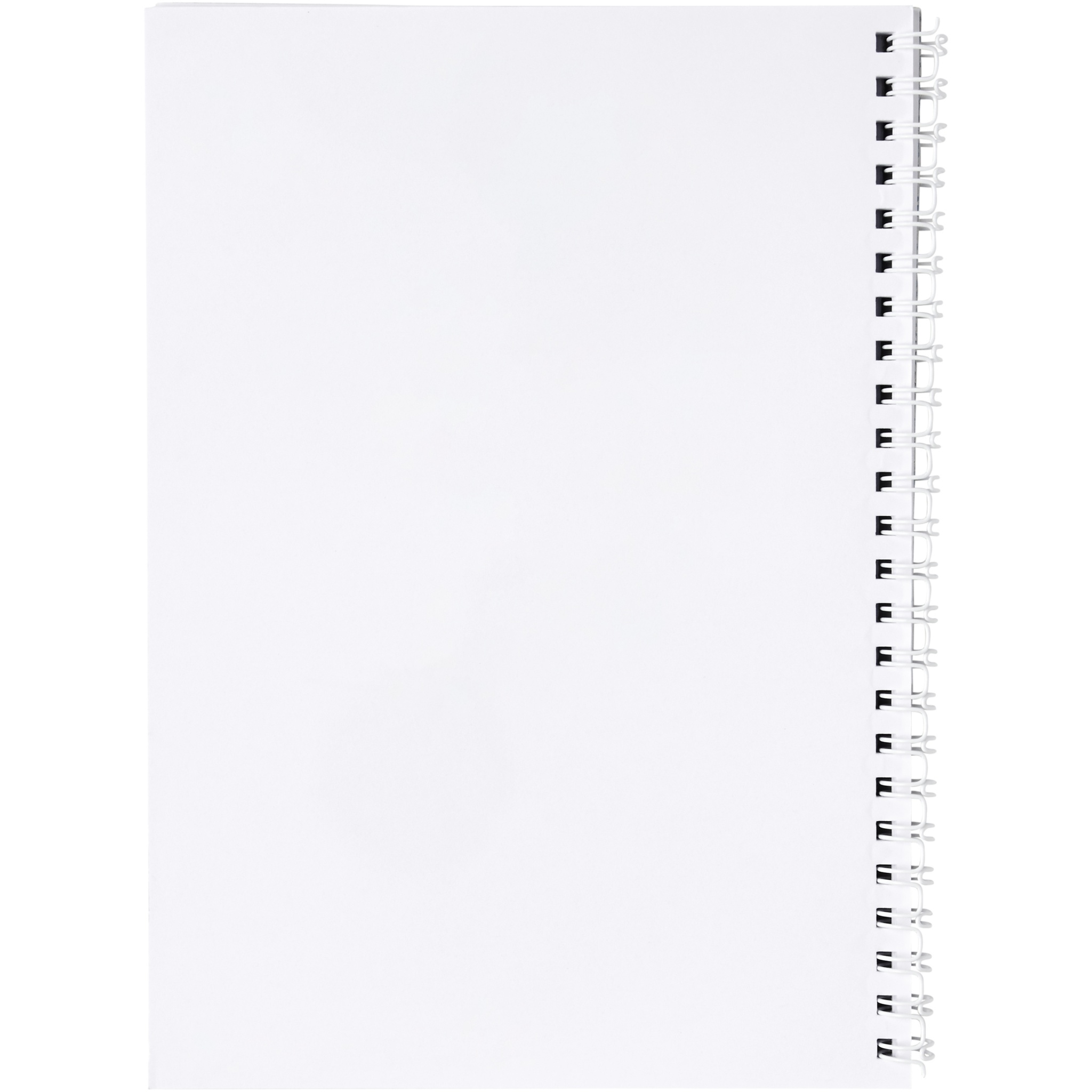Desk-Mate® spiraalne A5 märkmik. Standardmudel sisaldab 50 tühja paberilehte 80 g/m2, läikivat kaardi esikaant (250 g/m2) ja 450 mikronit läbipaistvat polüpropüleenist katet. Must või valge traat. Saadaval ka 100 lehega. Saate kohandada selle mitmekülgse märkmiku lehti mis tahes kujundusega – nii et olenemata sellest, kas soovite joonelist paberit, ruute või punkte – kõik on võimalik!
