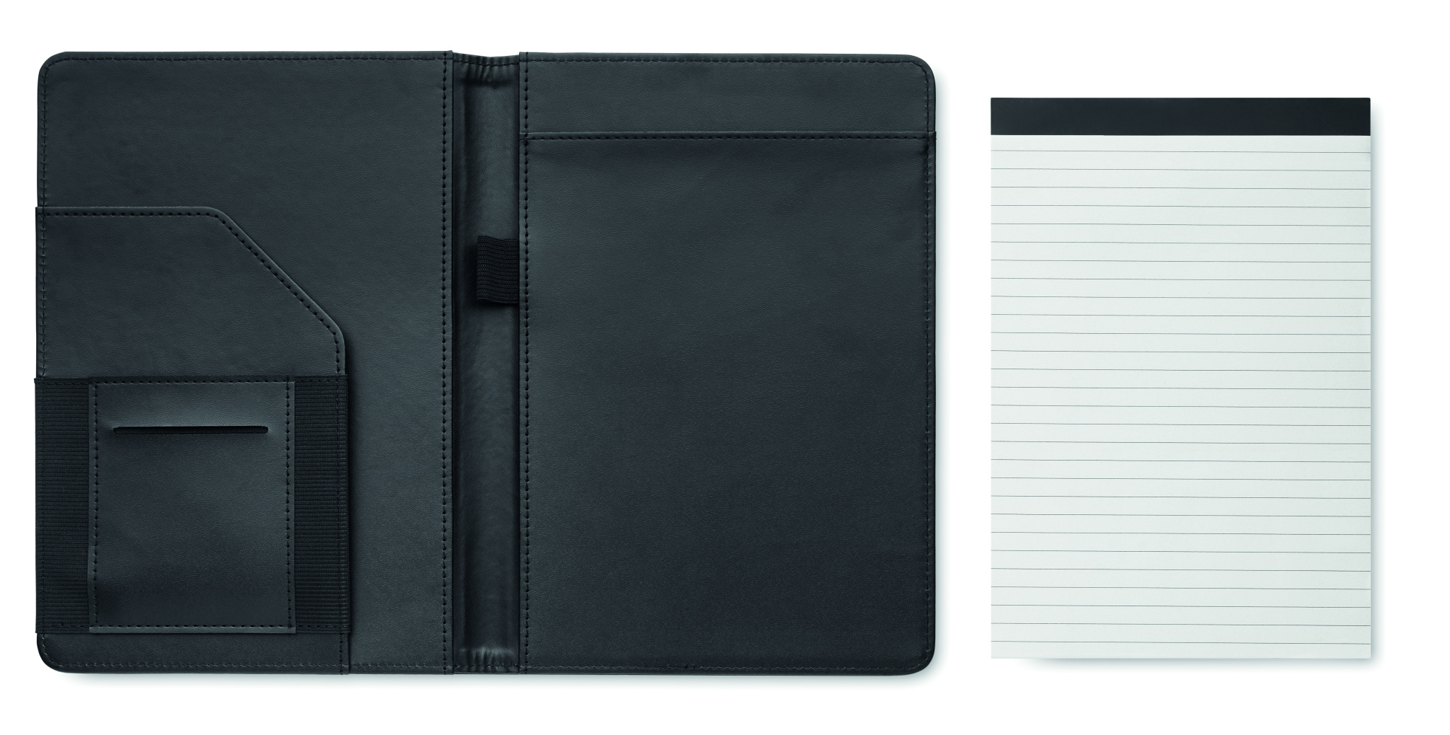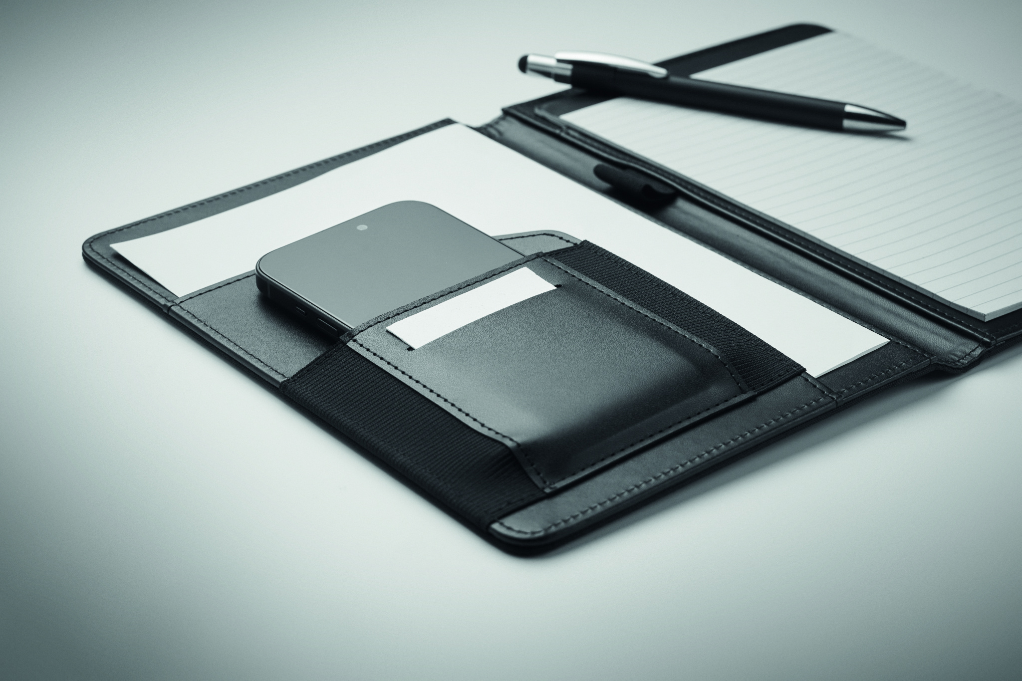A5 portfoolio 2 tooniga 300D RPET. Vahetatav A5 märkmik. 40 valge joonega bambusest paberilehte (20 lehte). Pliiatsihoidja. Kaardihoidjad siseküljel ja üks suur sahtel.