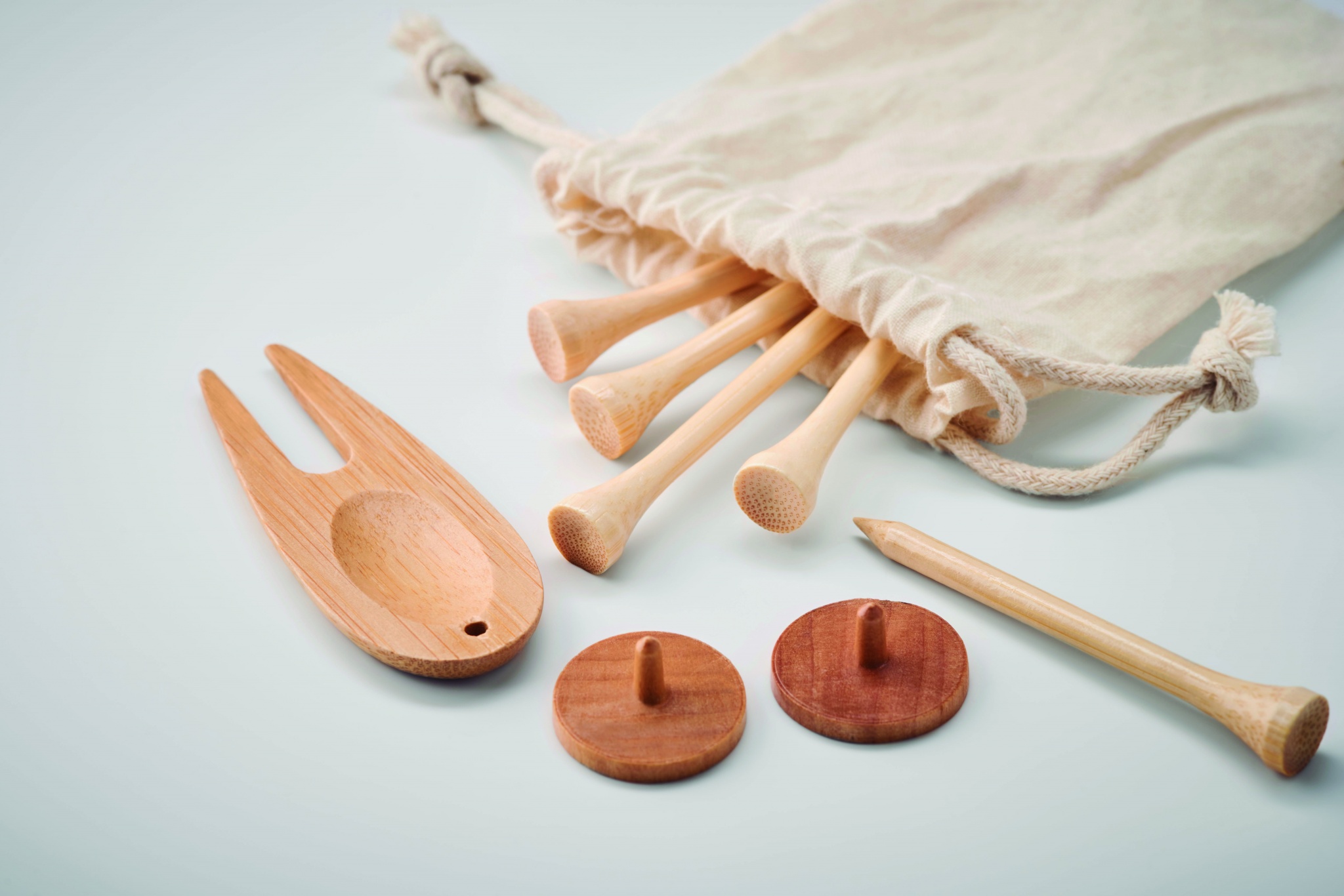 Bambusest golfitarvikud, sealhulgas 6 golfi triiki, 1 golfipalli ja 2 puidust golfipalli markerit, kõik orgaanilisest puuvillast nööriga kotis. Bambus on looduslik toode, ühe eseme värvis ja suuruses võib esineda väikesi erinevusi, mis võivad mõjutada lõppviimistlust.
