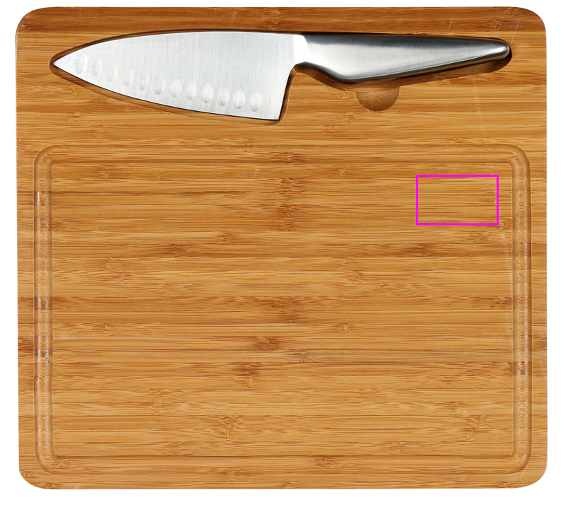 Kaunis bambusest lõikelaud integreeritud universaalse roostevabast terasest noaga. Nuga on fikseeritud süvendis oleva magnetiga. Kanname teie logo noa terale lasergraveerimisega.