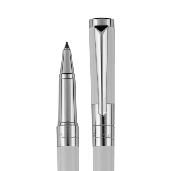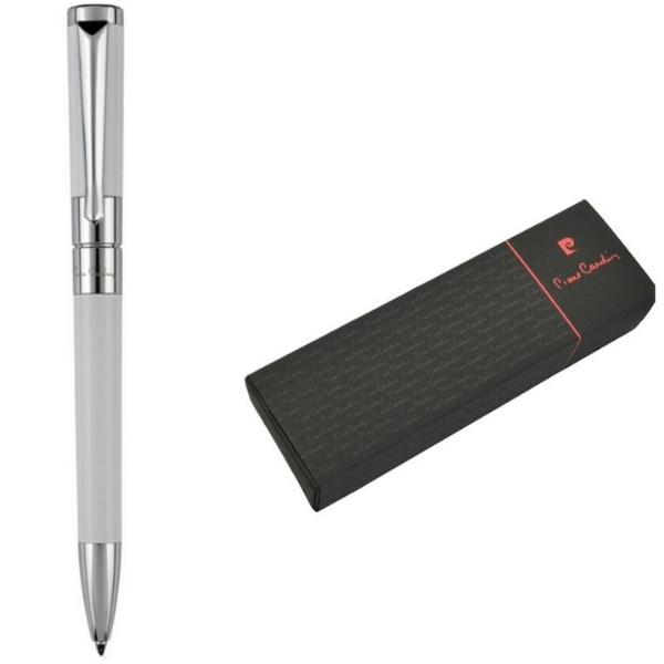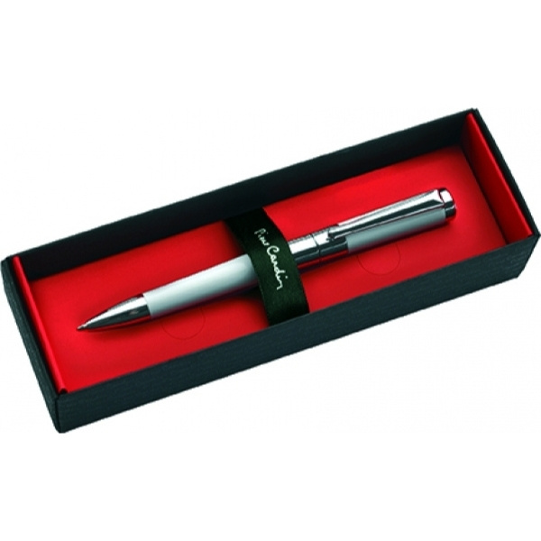 Elegantne ja kaubamärgiga metallist pastapliiats Pierre Cardin valget värvi hõbedaste detailidega. Pliiatsil on pöörlev mehhanism ja kvaliteetne sinine täidis, mille ots on 1 mm. See on varustatud ka varu musta täidisega. Pakendatud luksuslikku karpi Pierre Cardin, kaasas autentsussertifikaat.