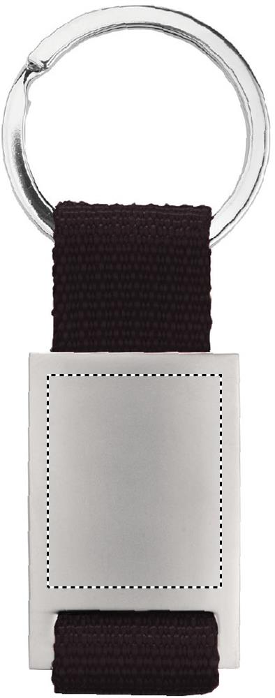Metallist ristkülikukujuline võtmehoidja värvilise polüesterrihmaga. Üksikult pakendatud kartongist kinkekarpi.