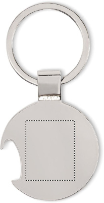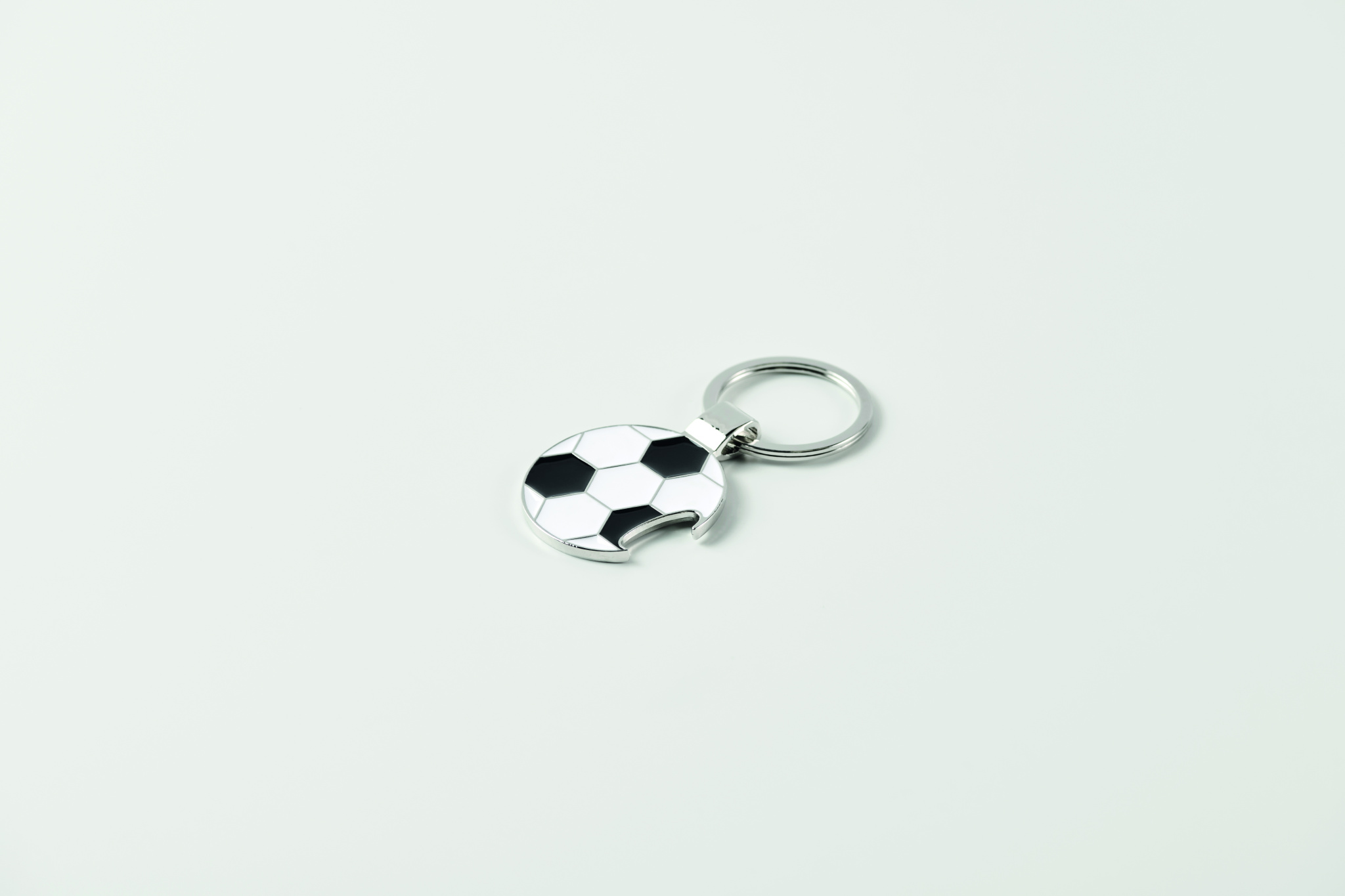 Tsingisulamist valmistatud jalgpallikujuline pudeliavaja võtmehoidja rauast rõngaga.