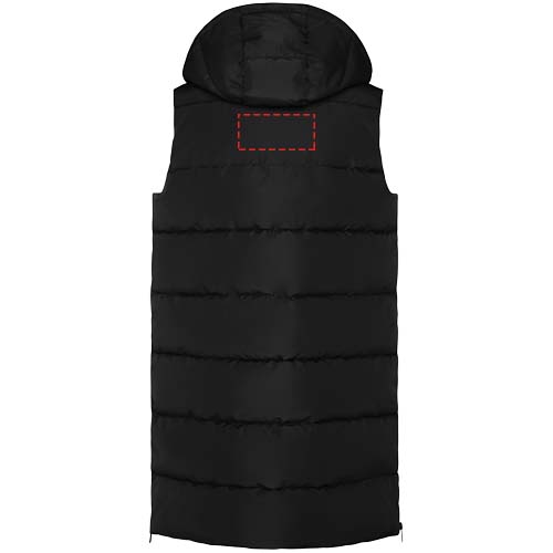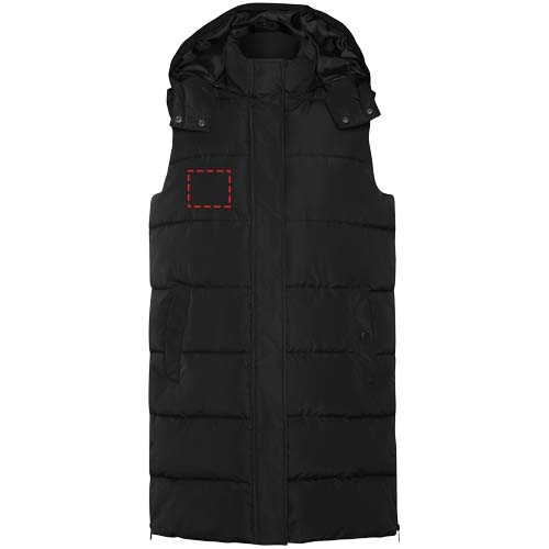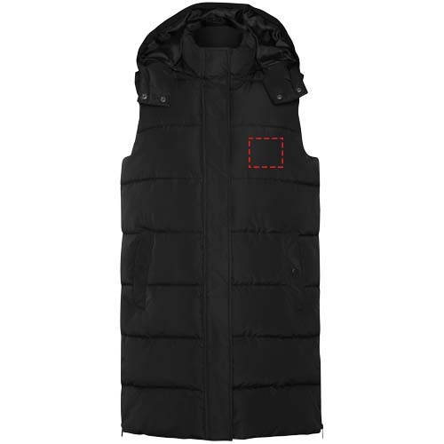 Polsterdatud kehasoojendaja eemaldatava kapuutsiga. Kõrge krae. Ees tõmblukk, mida varjab klapp. Kaks nööbiga suletavat taskut. Tõmblukuga küljeavad. Juurdepääs rinnakorvi sisemusse. Vett hülgav.