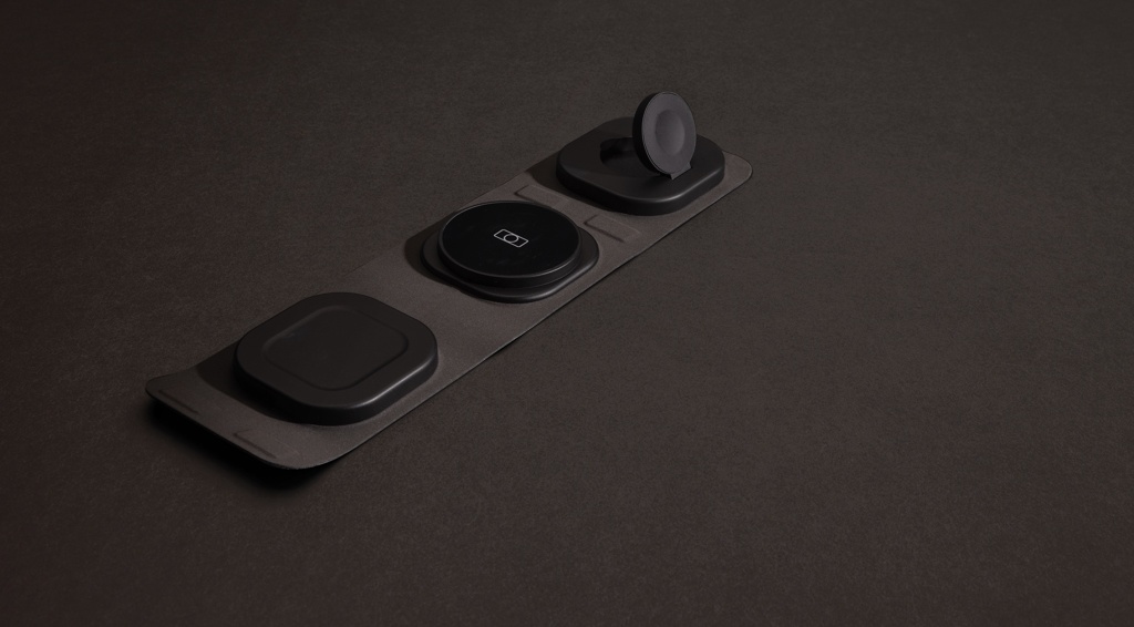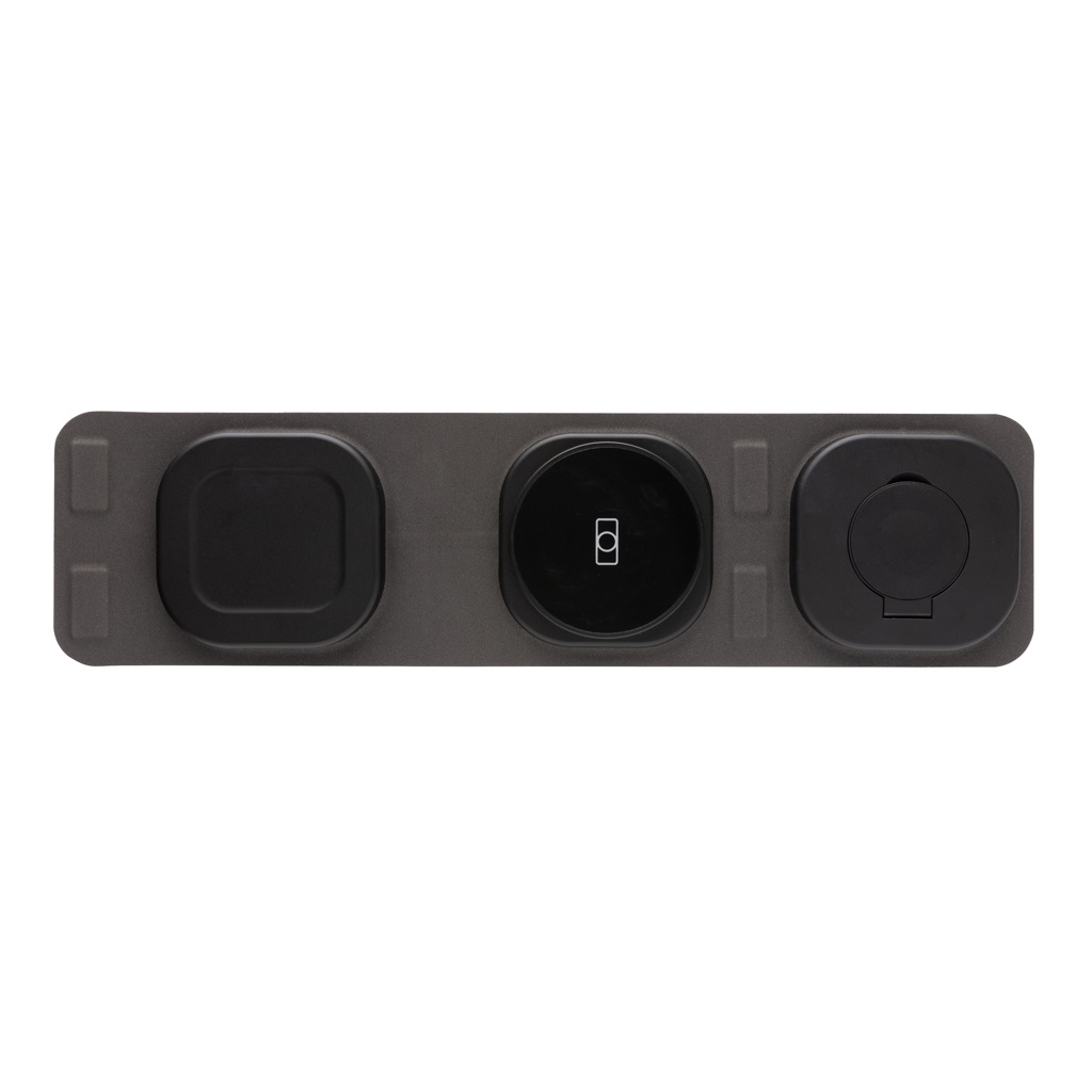 Luksuslik ja kokkupandav kolm-ühes juhtmevaba laadija, mis on valmistatud RCS-i ringlussevõetud ABS-ist Kogu taaskasutatud sisaldus: 46% eseme kogukaalust. RCS-sertifikaat tagab taaskasutatud materjalide täielikult sertifitseeritud tarneahela. Juhtmeta laadija on varustatud magnetilise 15 W juhtmevaba laadija ja täiendava 5 W juhtmevaba laadijaga, mis sobib kõrvaklappide või muude väikeste juhtmevabade laetavate seadmete jaoks, ning 2,5 W juhtmevaba laadijaga nutikellade jaoks (ainult Apple'i kellad). Kaasa arvatud RCS-sertifikaadiga 120 cm taaskasutatud TPE kaabel. Pakitud FSC® mix kraft pakendisse. Toode ja tarvikud 100% PVC-vaba. Sisend: 9V/3A optimaalseks kasutamiseks. Väljund: Telefon: 9V/1.1A; 9V/1,67 A/(15W), kõrvaklapid: 5V/1A (5W), käekell: 5V/0,5A.