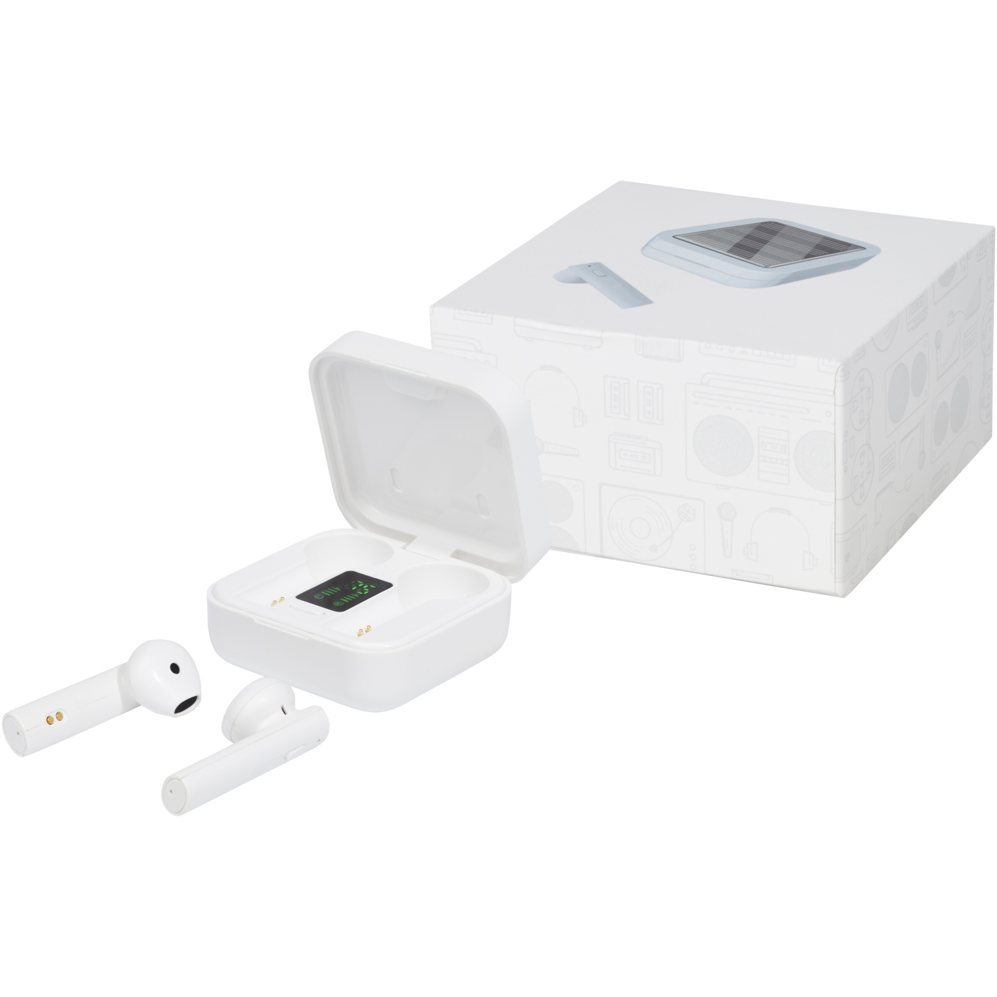 Stiilsed TWS (True Wireless Stereo) kõrvaklapid koos tõhusa päikesepaneeliga, mis on integreeritud laadimisümbrisesse. Ideaalsed kõrvaklapid välitegevusteks, kuna neid saab laadida päikeseenergiaga, kui toiteallikad pole saadaval. Bluetooth® 5.0 stabiilse ühenduse ja madala energiatarbimise tagamiseks, ühenduse ulatusega kuni 10 meetrit. Taasesitusaeg maksimaalse helitugevusega kuni 3 tundi. Laadimisümbrises olev 200 mAh taaslaetav polümeeraku suudab laadida kõrvaklappe 0–100% kuni 3 korda. Ergonoomiline disain ja mugav kanda koos integreeritud multifunktsionaalse nupuga kuularil otsetee juhtimiseks. Tarnitakse esmaklassilises kinkekarbis.