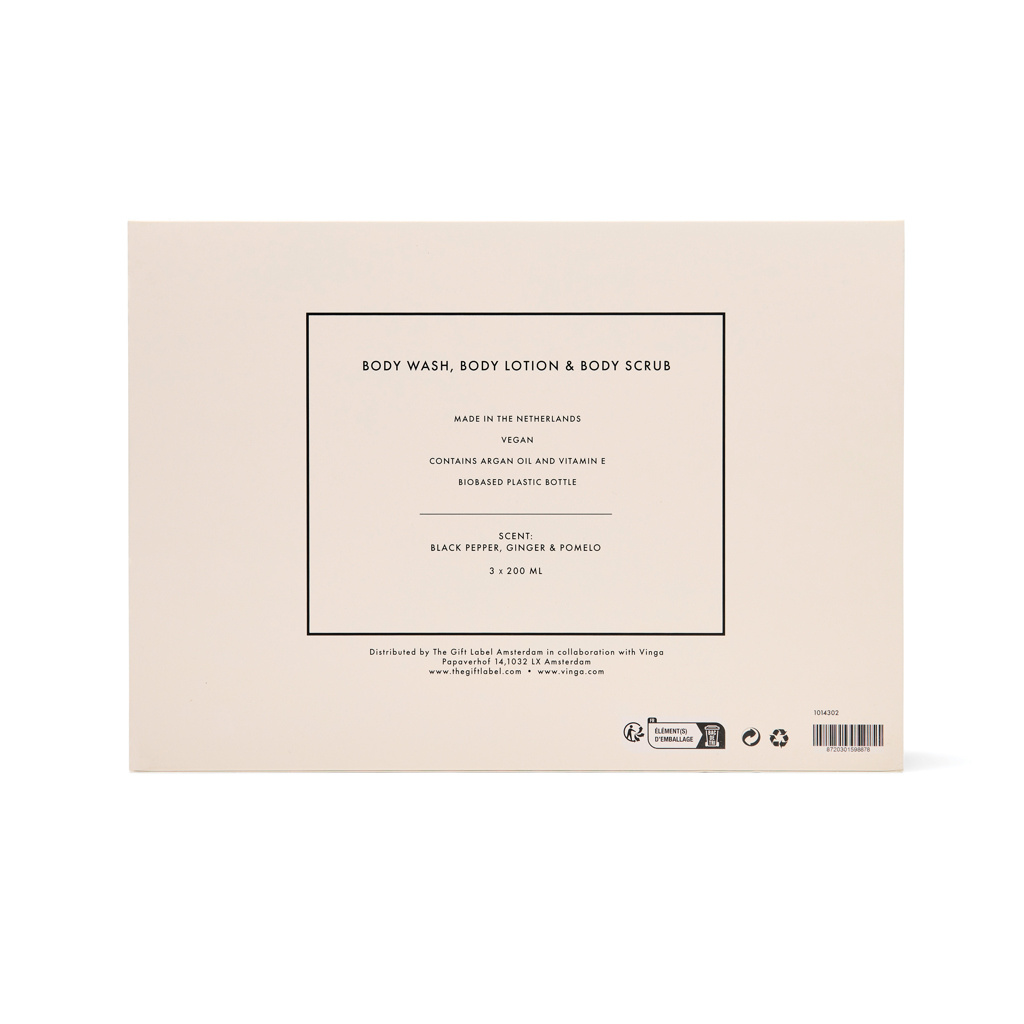 See kolmeosaline komplekt sisaldab 200 ml dušigeeli, kehakoorijat ja kehakreemi. Musta pipra, ingveri ja pomelo sooja ja värske aroomiga rikastatud komplekt jätab naha siledaks, värskeks ja õrnalt lõhnastatuks. Pakendatud elegantsesse kinkekarpi.