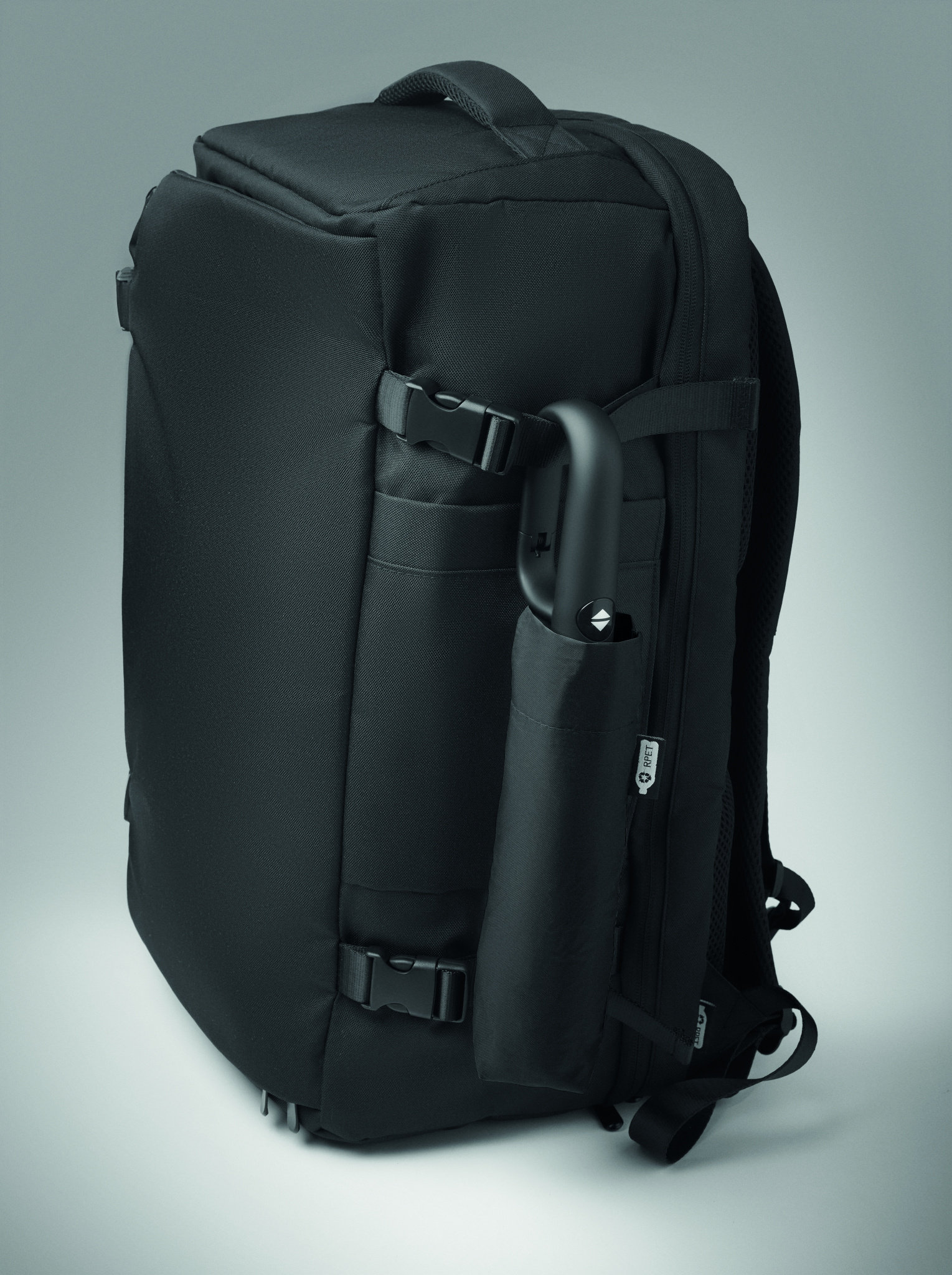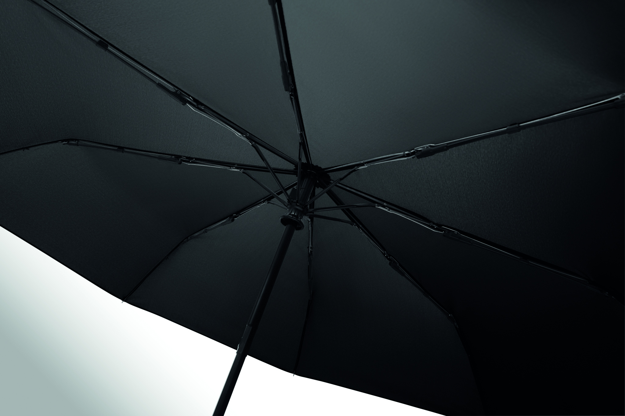 Taitettava 21'' tuulenpitävä sateenvarjo, jossa on täysin musta pinnoitettu lasikuiturunko, jossa on 2 osaa. Lasikuituiset kylkiluut. 190T RPET pongee-paneelit. D-muotoinen karabiinikahva w / kumipinta,. Automaattinen avautuminen ja sulkeminen. Sisältää pussin