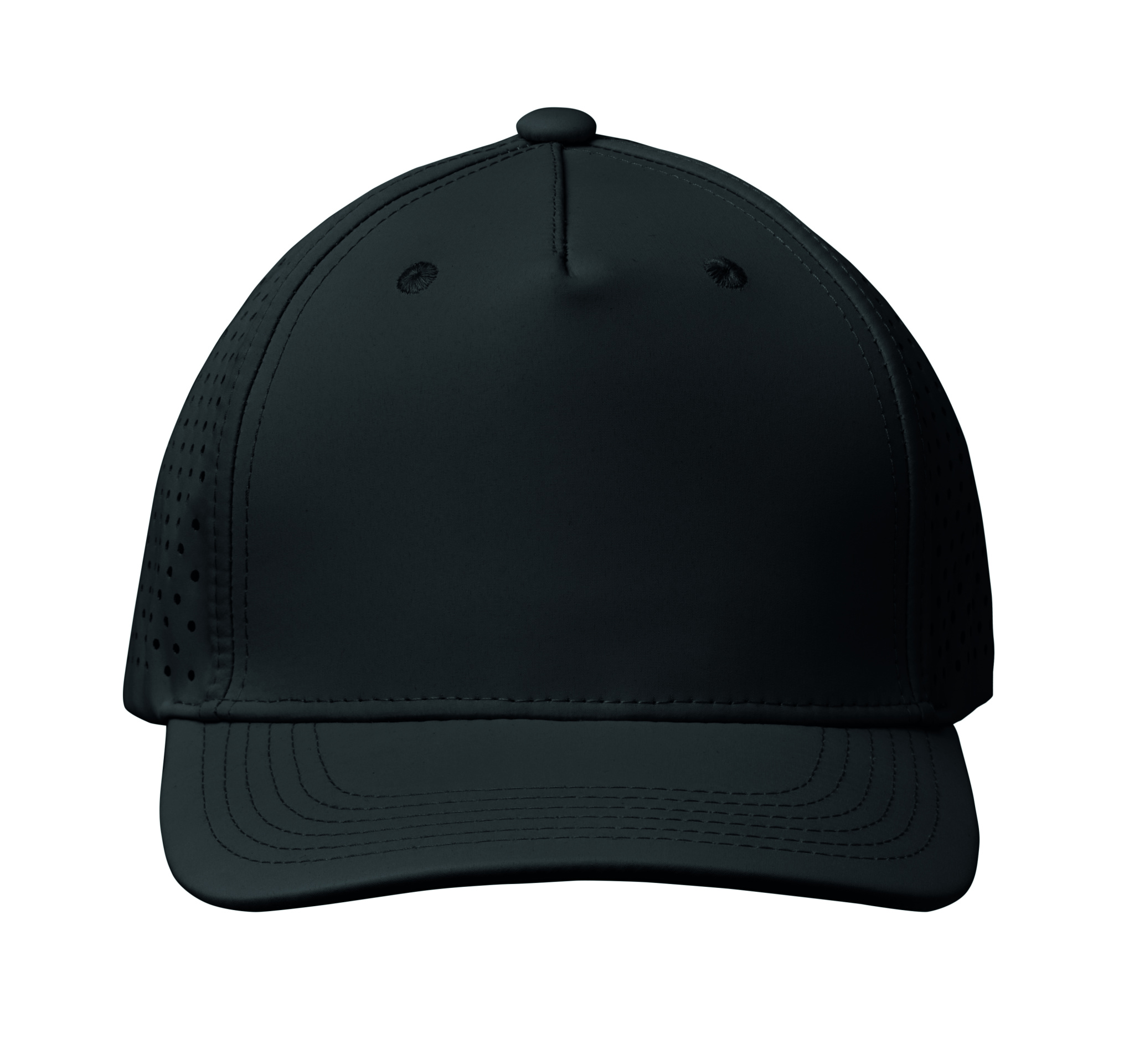 5 paneelista valmistettu polyesterikorkki, jossa on säädettävä koukku ja silmukkasuljin sekä laserrei'itetyt reiät, joissa on 2 ommeltua silmukkaa yhteensopivalla värillä. Tuote on nopeasti kuivuva, hikeä ja vettä hylkivä. 200 g/m²