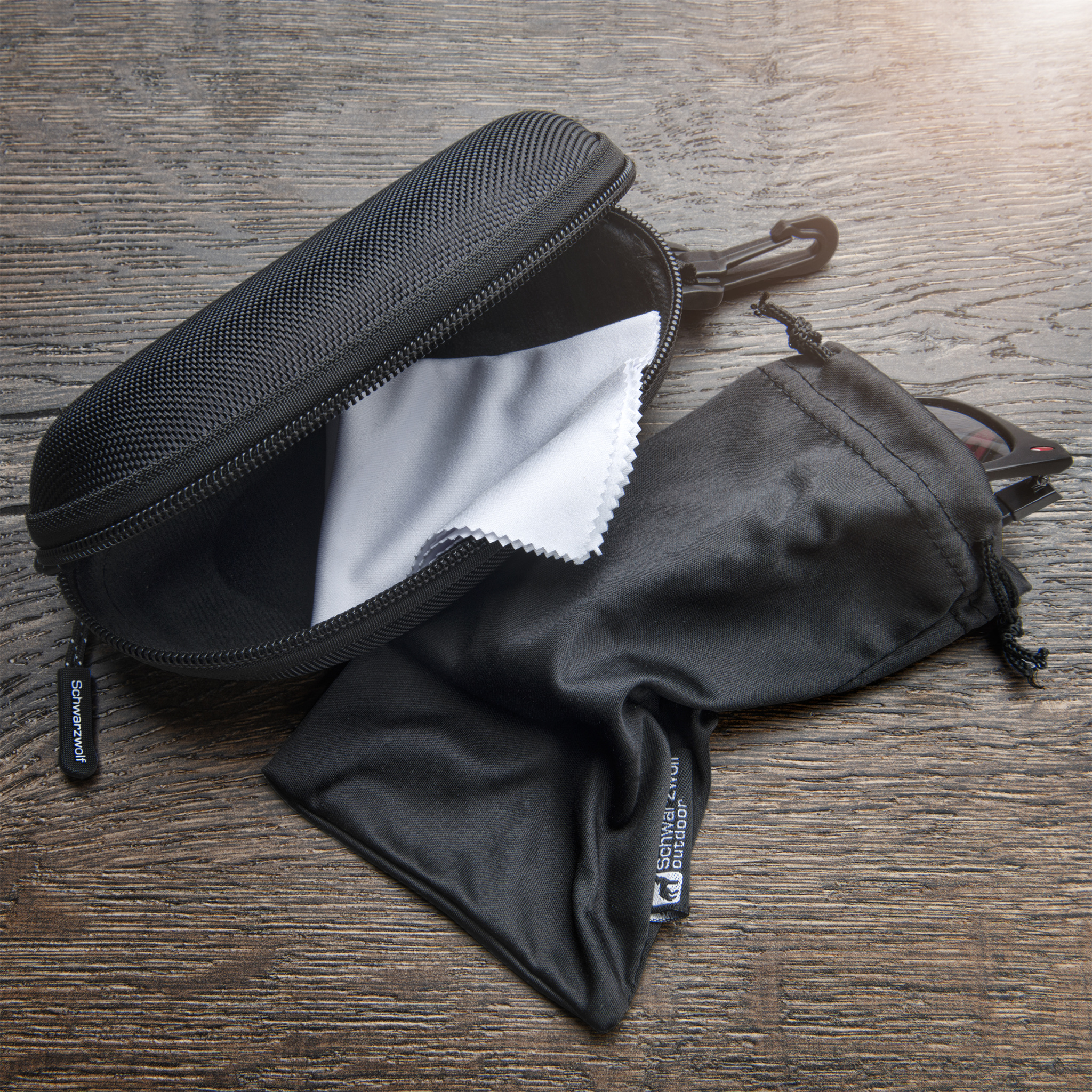 Kova kotelo aurinkolaseille. Kotelo on valmistettu kankaasta ja samettimateriaalista, väriltään musta. Kotelossa on vetoketju ja Schwarzwolf-logo vetoketjun liukusäätimessä. Sisältää mustan mikrokuitupussin ja valkoisen mikrokuituisen puhdistusliinan, joka soveltuu sublimaatioon. Pakattu Schwarzwolfin lahjarasiaan.
