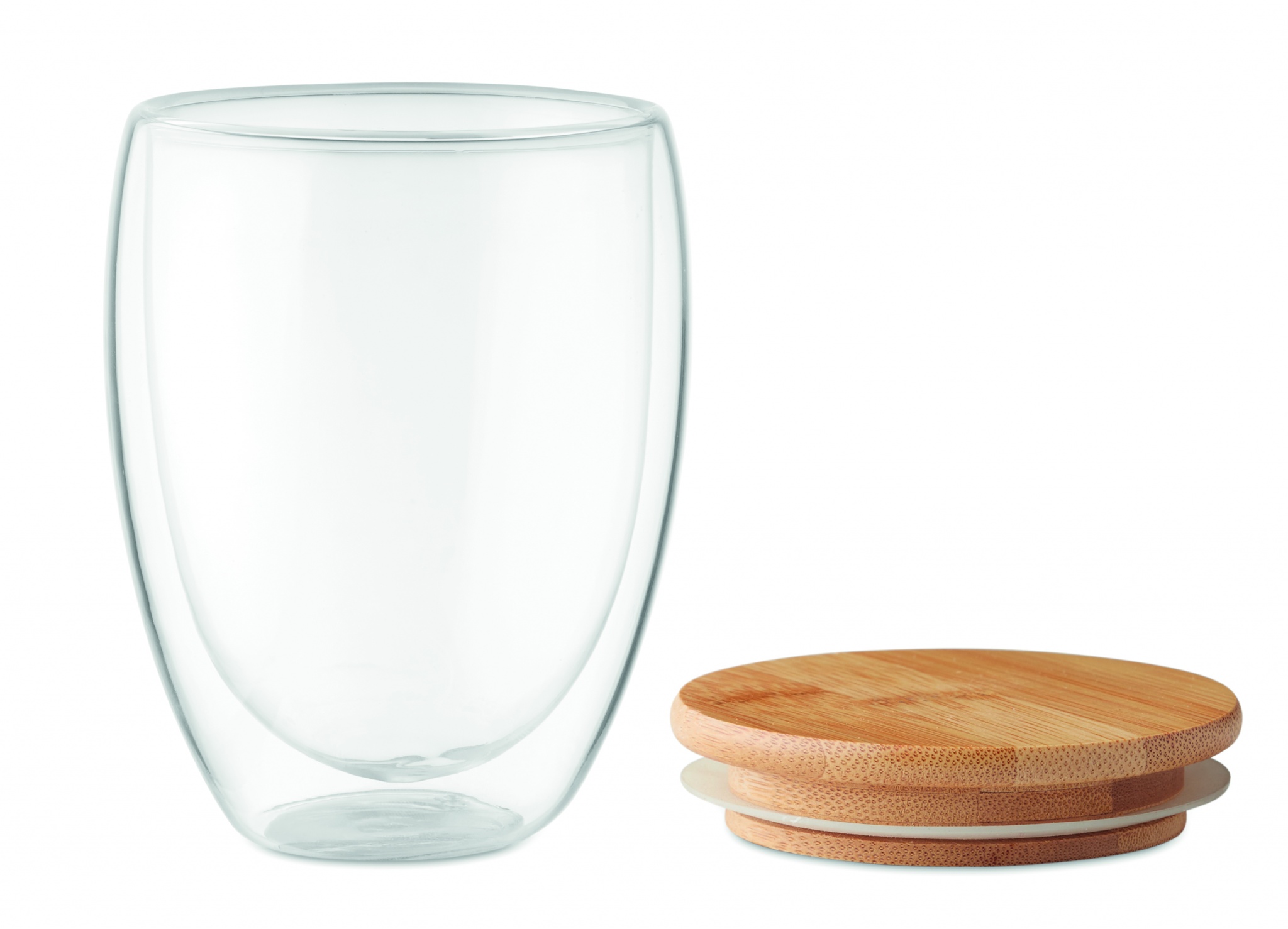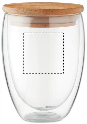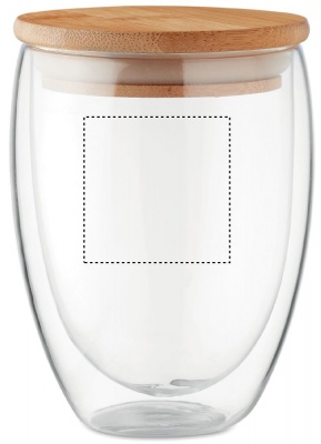 Kaksiseinäinen 350 ml borosilikaattilasi bambukannella, kannessa silikonirengas. Luonnollisen materiaalin (bambu) vuoksi, tuotteiden värissä/ koossa saattaa olla erinäisyyksiä ja tämä voi vaikuttaa painatuksen lopputulokseen.