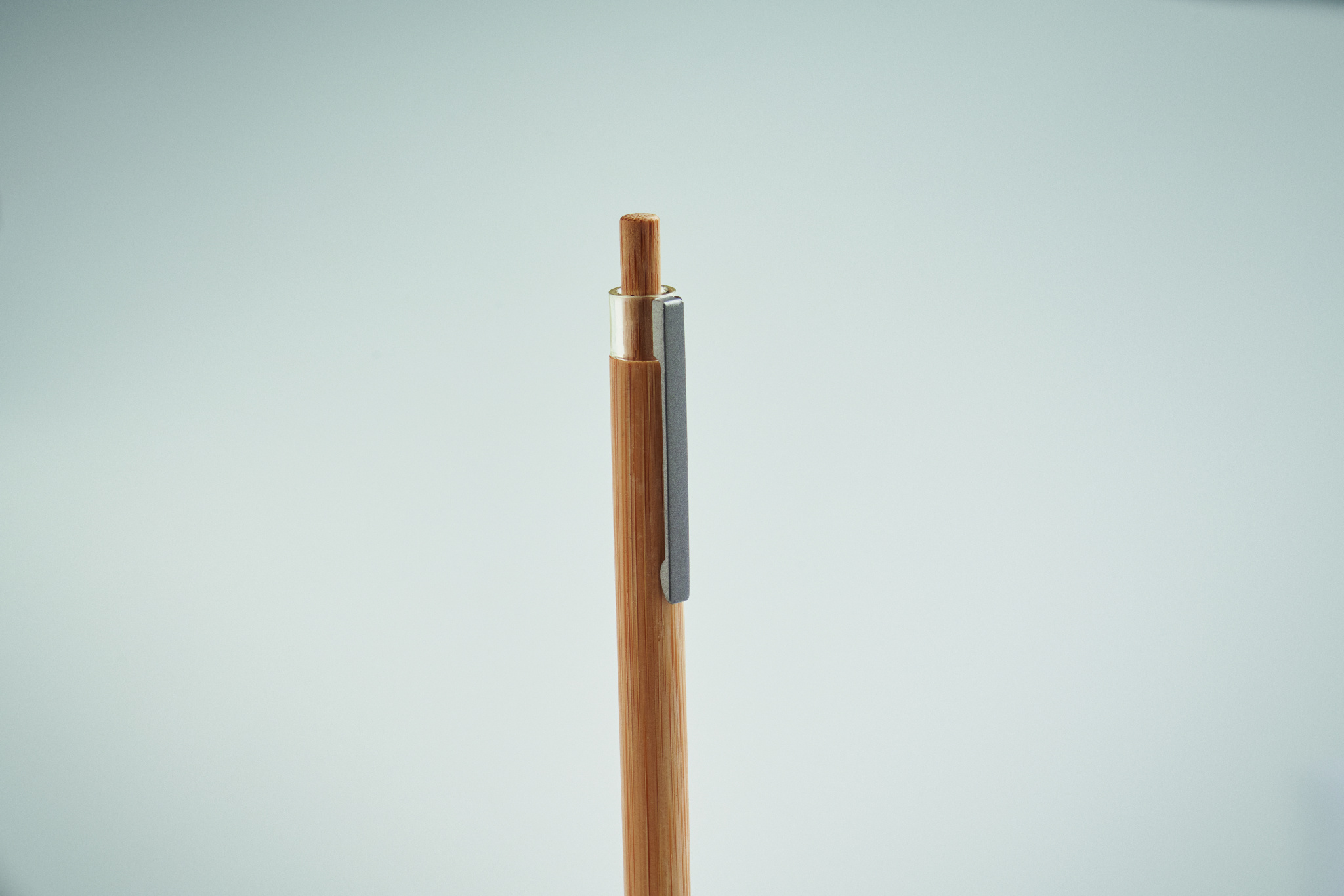 Painonappikynä, jossa bamburunko ja metalliklipsi. Sininen muste.