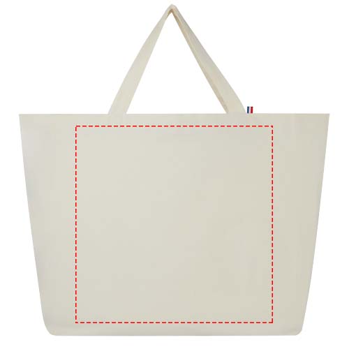 Tämä kassi on valmistettu laadukkaasta 100% kierrätysmateriaalista. 200 g/m² puuvilla/ polyester sekoitemateriaalista valmistettu kassi kestää päivittäistä käyttöä ja sopii raskaiden kirjojen tai ruokaostosten kuljettamiseen, kantokyky 14 kg. Kankaan kuitu on valmistettu Aasiassa, kudonta ja kehräys ja valmistus tehdään Ranskassa.