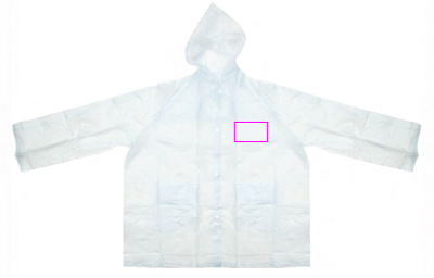 PVC-sadetakki (yksi koko XL) läpinäkyvä himmeä huppu, kaksi etutaskua ja painonapit. Painamme logosi rintaan (sydämen puolelle).