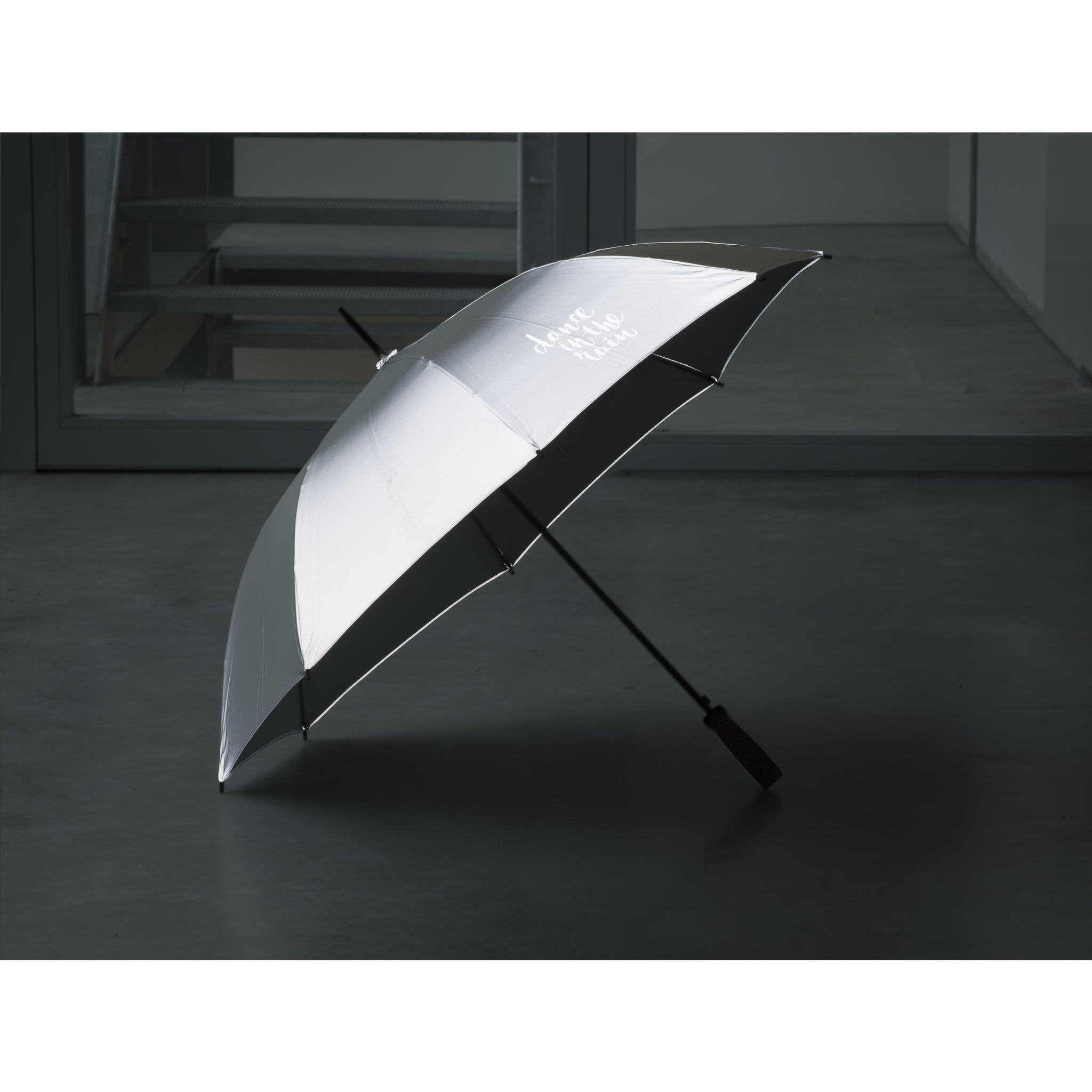 Hyvin näkyvä sateenvarjo, joka on valmistettu 190T fluoresoivasta "high-visibility" -polyesteristä. Automaattinen teleskooppiaukko, lasikuiturunko, metallivarsi, pehmeä kahva ja tarrakiinnitys.