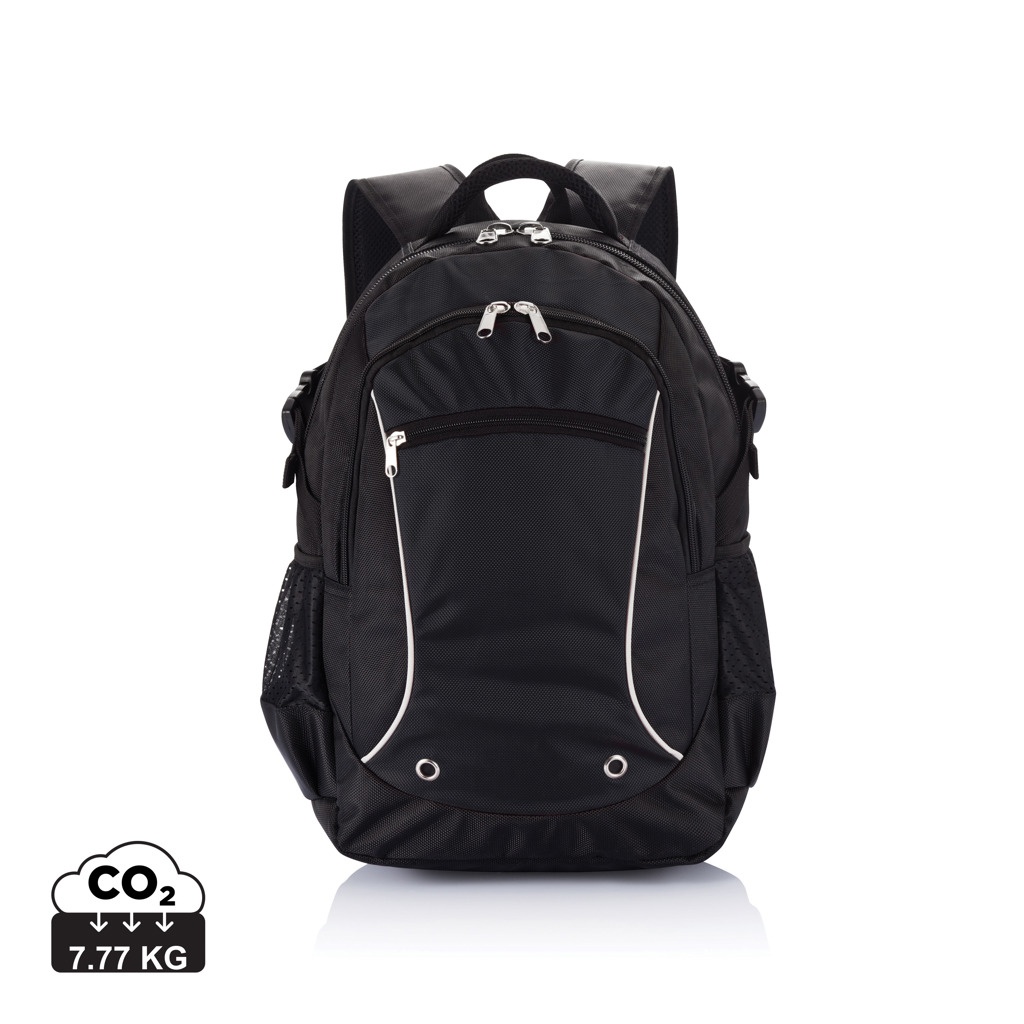 1680D jakardikuvioinen selkäreppu. Vetoketjullinen etutasku pitää tavarat järjestyksessä. Vetoketjullinen päätasku, pehmustettu, 15,6” kannettavalle tietokoneelle. Heijastavat reunoitukset. Kaksi verkkotasku sivuilla. Ei sisällä PVC:tä.