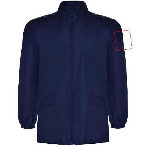 Vedenpitävä sadetakki. Korkea kaulus ja irrotettava huppu säädettävillä nauhoilla. Keskellä vetoketju ja saman sävyinen vedin. Kaksi sivutaskua suojaavilla listoilla. Joustavat hihansuut. Joustava nauha tasku sisäpuolella viikkaamista ja säilytystä varten. Kuvan malli on 185 cm pitkä ja hänellä on päällään koko L.