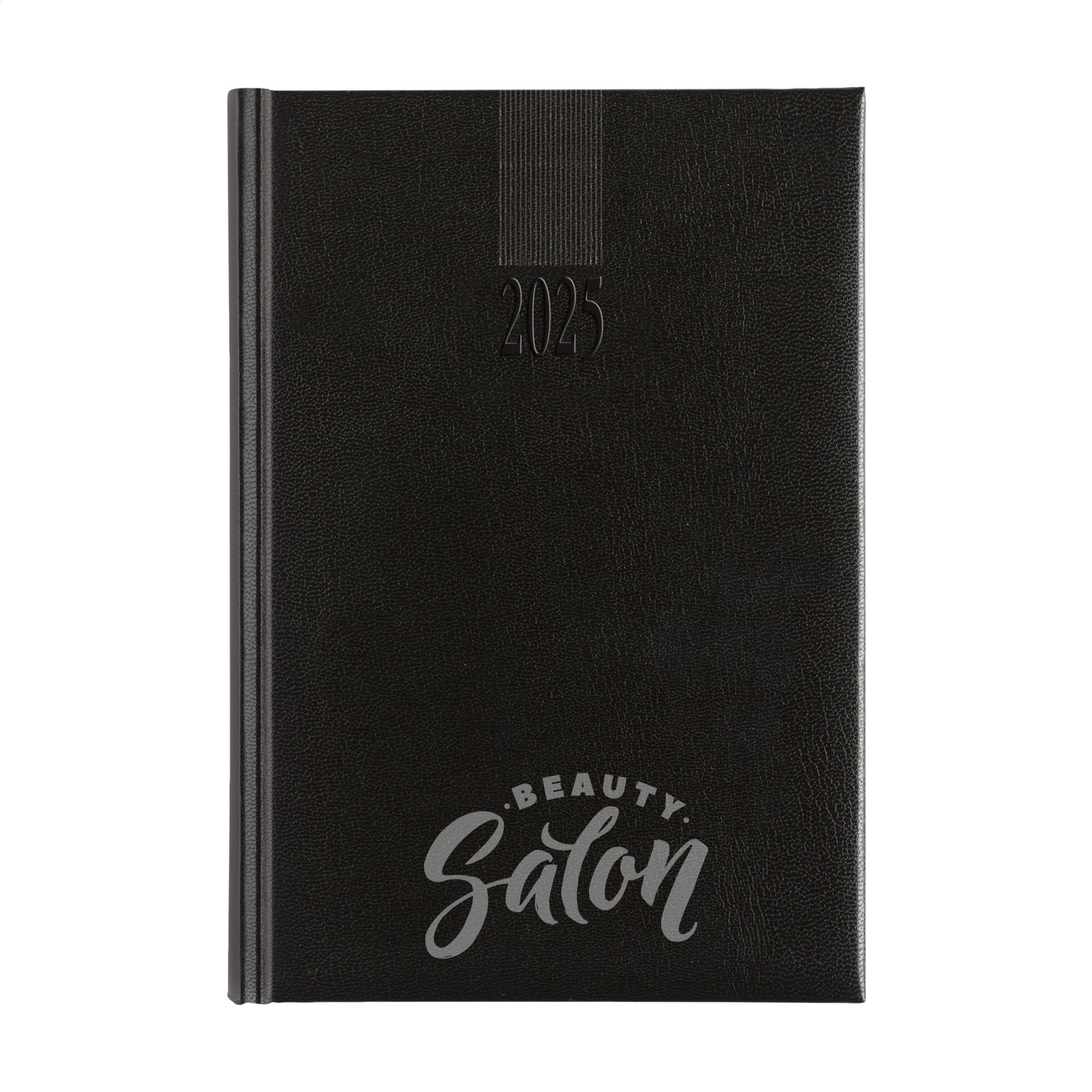 Kuuden kielen toimistopäiväkirja: EN, NL, F, D, I ja ES. Kestävä pehmustettu Balacron-kansi ja koristeellisesti kohokuvioitu vuosiluku edessä, 70 g valkoista, FSC Mix -sertifioitua paperia, painettu 2 värillä, lankasidottu, repäisypäivämääräiset kulmat, yksi päivä per sivu (lauantai ja sunnuntai yhteensä), vuosi suunnittelija kuluvan vuoden ja seuraavan vuoden 2 vuosineljännestä, muistiin tilaa jokaiselle päivälle, lisäsivuja hyödyllistä tietoa. Lähes A5 kokoa.