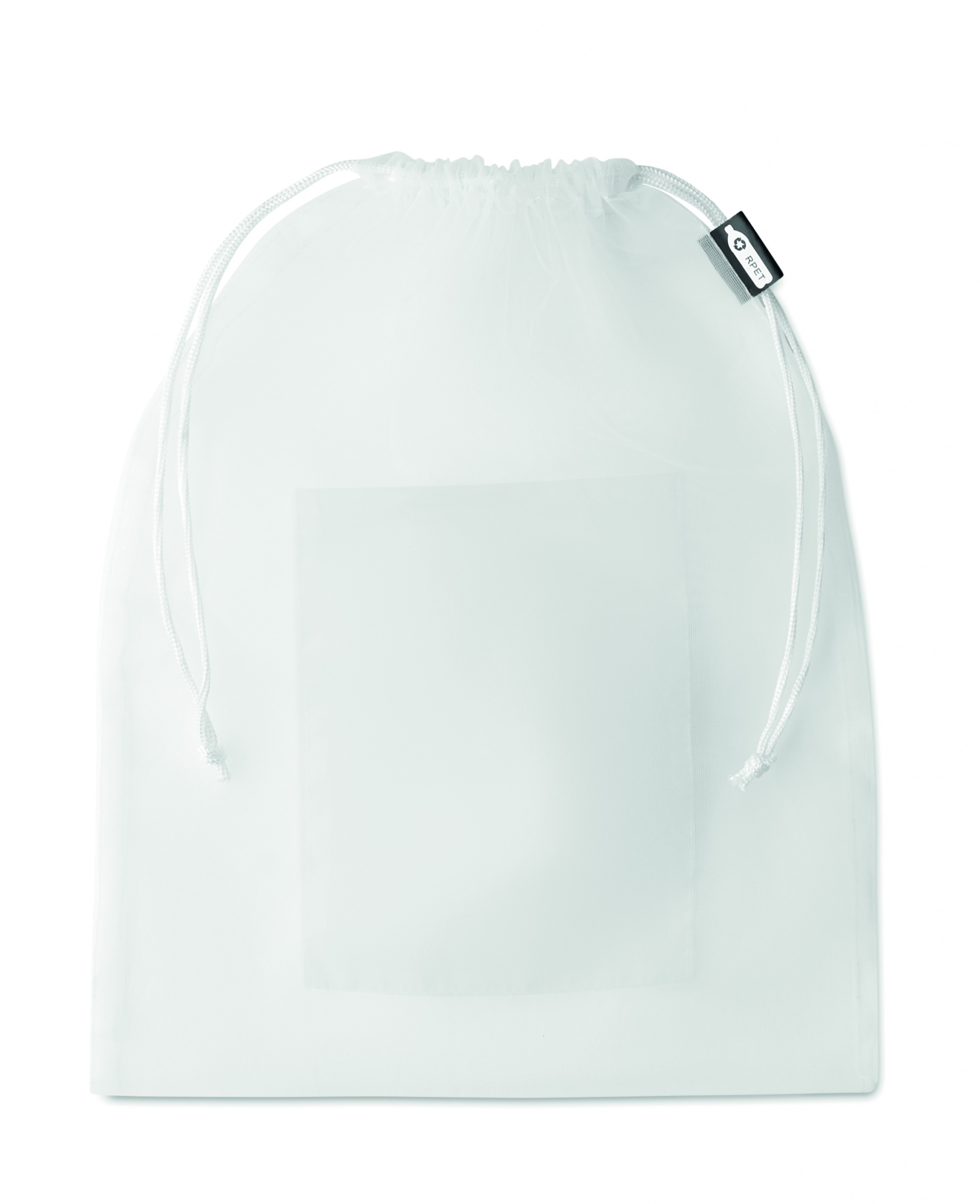 RPET verkko hedelmäpussi PP naruilla ja etutaskulla.