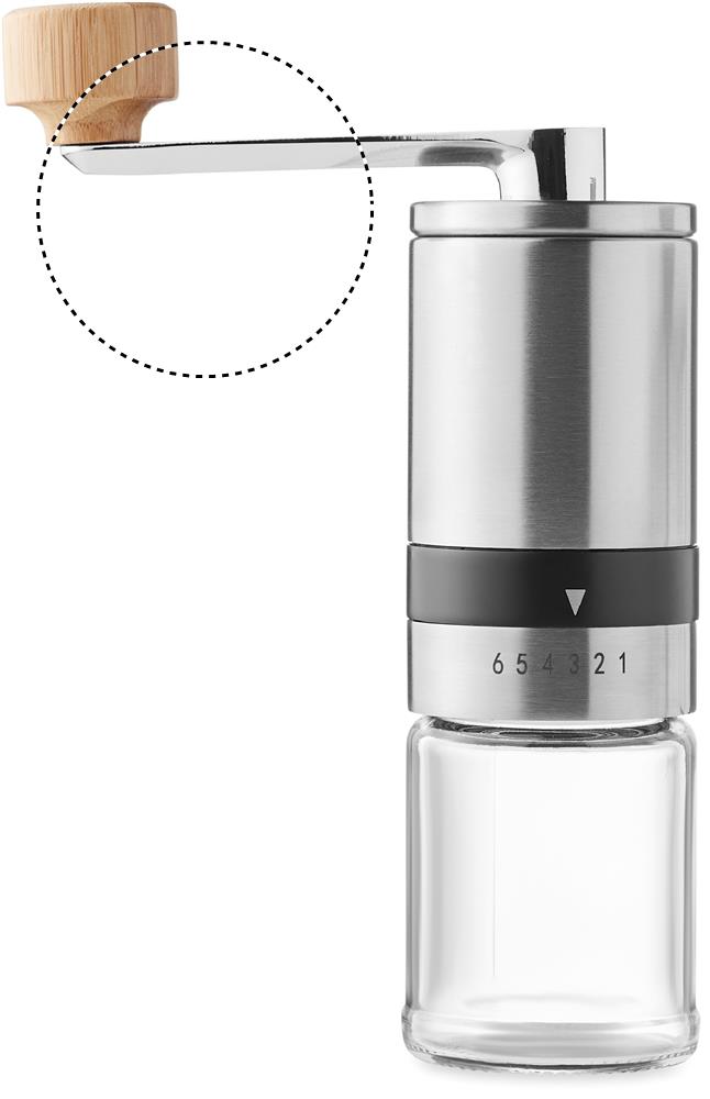 Kahvisetti, sisältää lasisen ruostumattomasta teräksestä valmistetun 350 ml kahvinkeittimen ja manuaalisen keraamisen 100 ml kahvimyllyn.