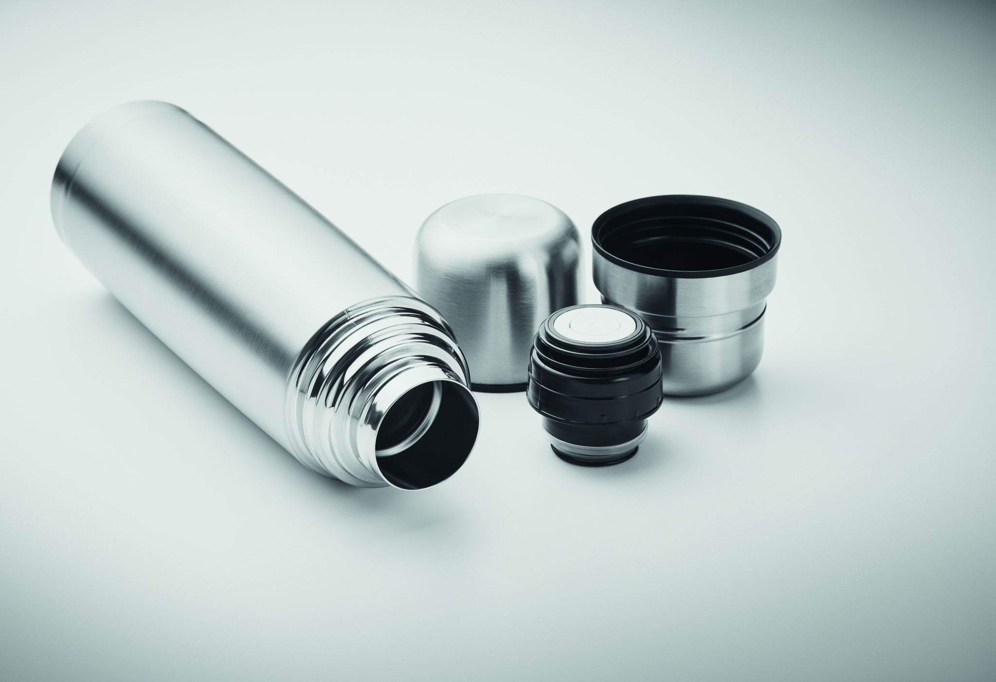 Kaksiseinämäinen kierrätettyä ruostumatonta terästä (90 % kierrätettyä ruostumatonta ja 10 % ruostumatonta terästä) eristetty tyhjiöpullo, jossa on 2 integroitua kuppia (sisäseinä PP) kannessa. Pullon tilavuus: 750 ml, ulompi kuppi: 150 ml, sisäkuppi: 125 ml.