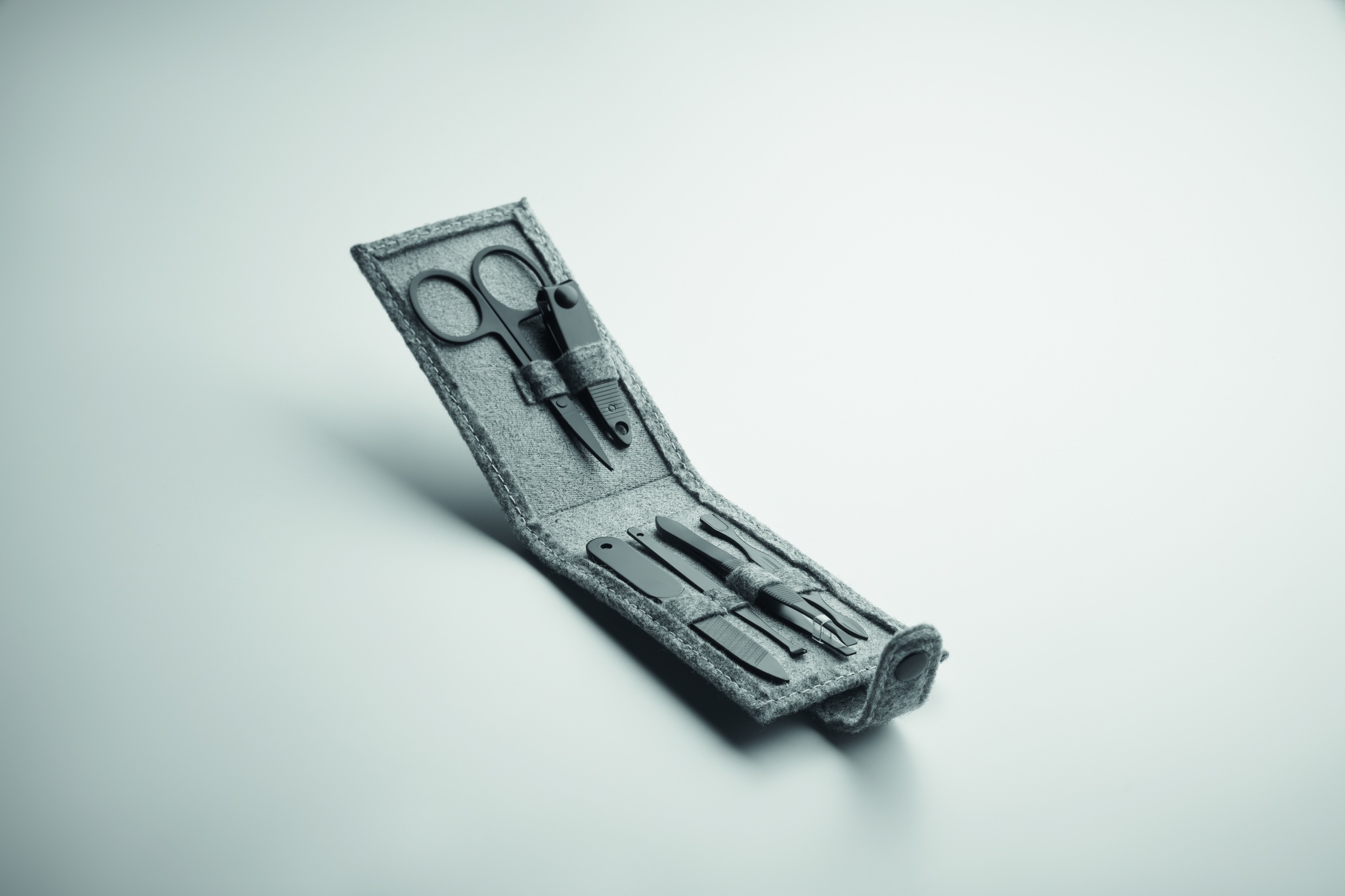 6-osainen ruostumattomasta teräksestä valmistettu manikyyrisarja suorakulmaisessa RPET-huopapussissa.