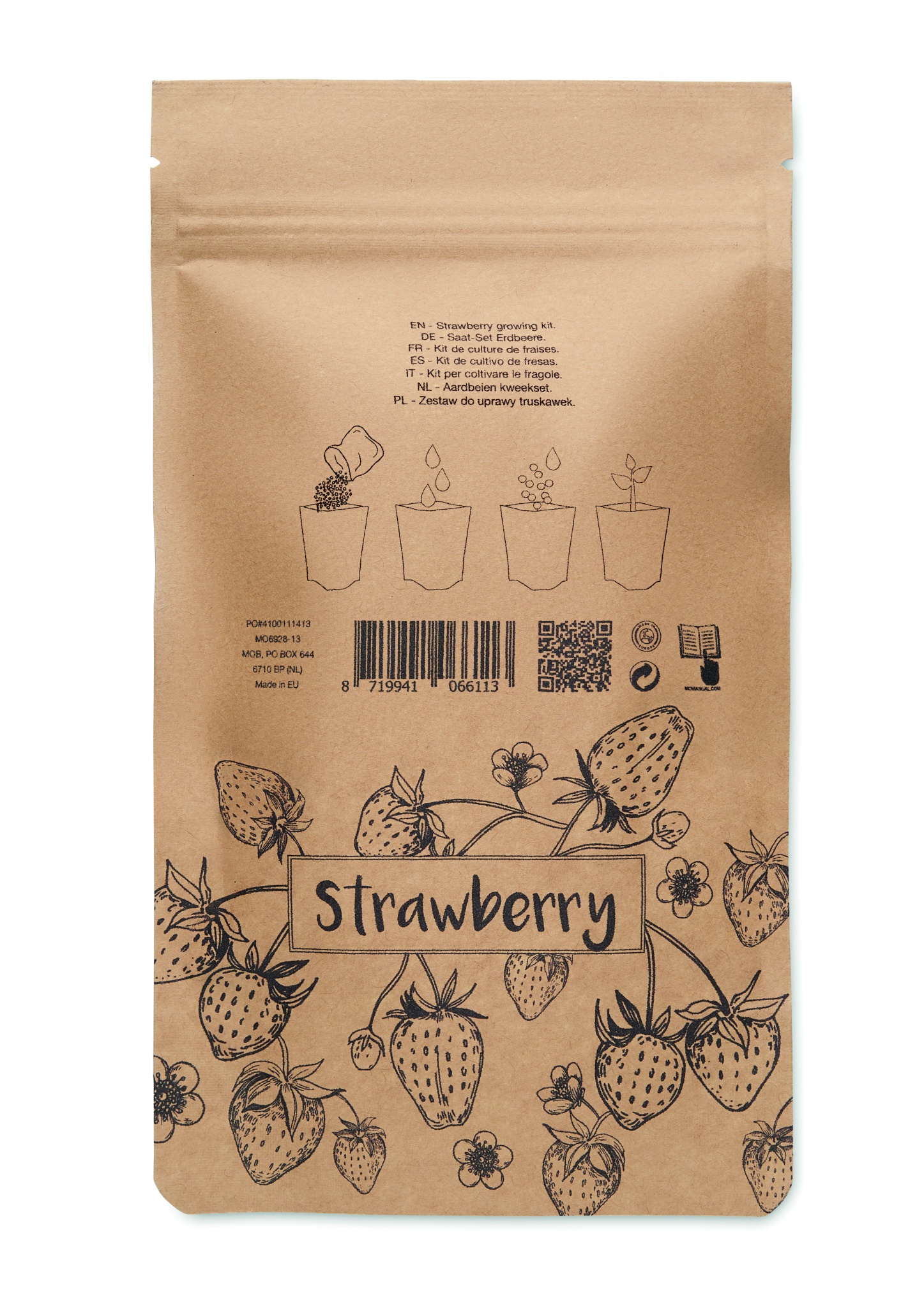 Mansikanviljelypakkaus, jossa siemeniä sekä kompostimultaa paperipakkauksessa. Valmistettu EU:ssa.