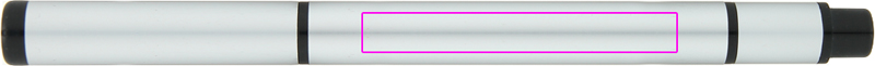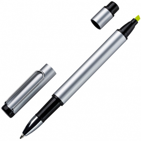 Alumiininen kuulakärkikynä, jossa musta kirjoitustäyttö ja keltainen korostuskynä toisella puolella. Kaiverremme logosi varteen.