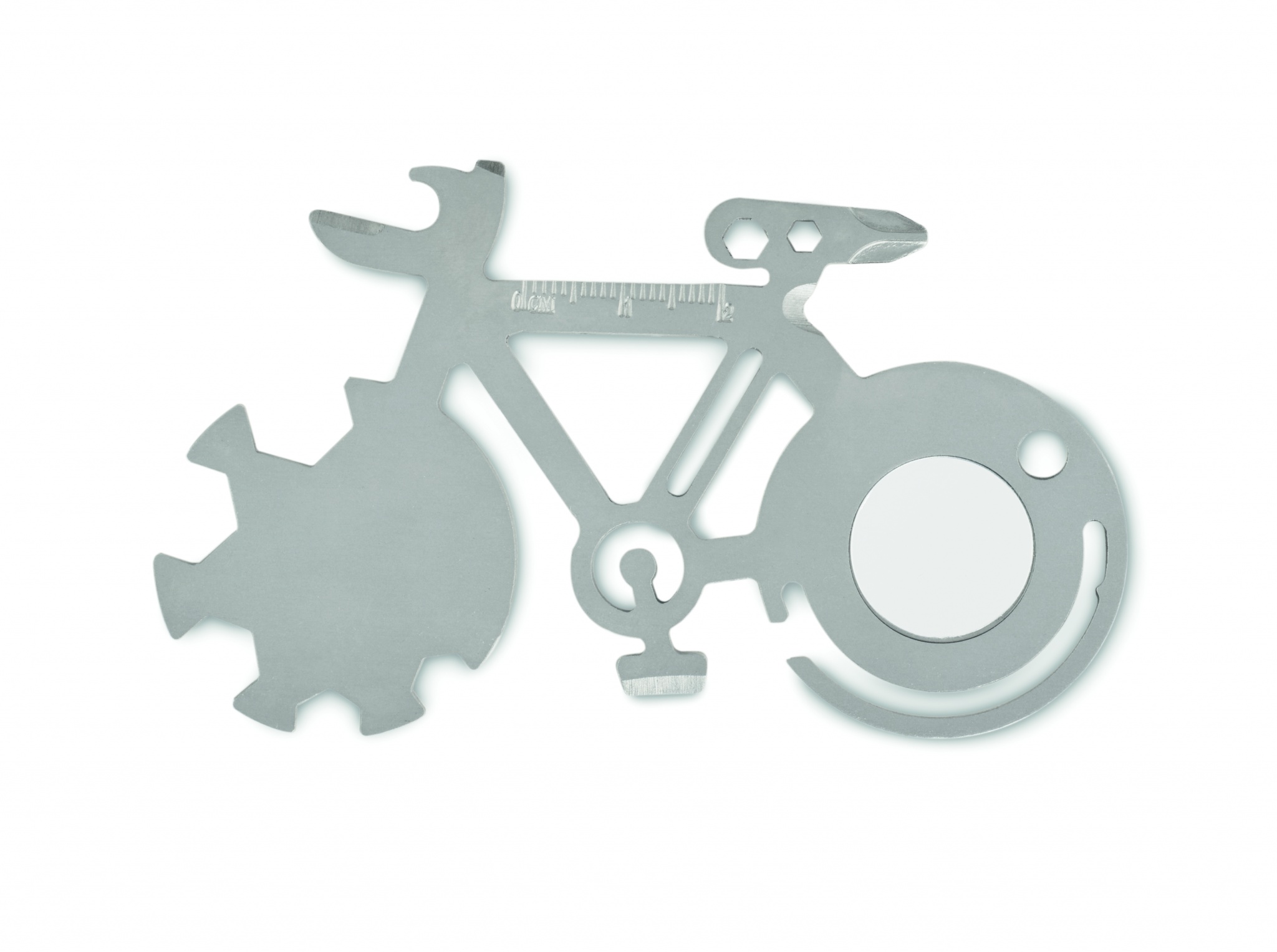 Monitoimityökalu 11-in-1. Polkupyörän muotoinen, ruostumattomasta teräksestä valmistettu työkalu jossa on mm. pullonavaaja, veitsi, viivain ja ruuvimeisselit.